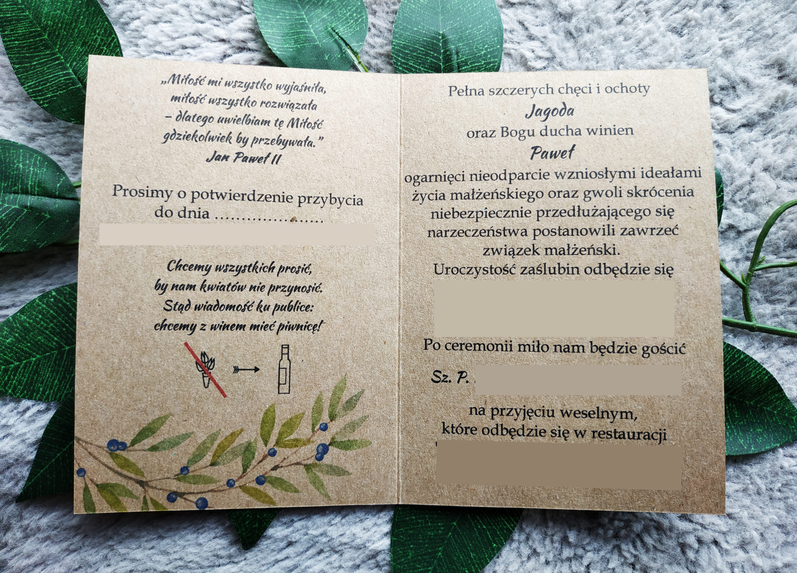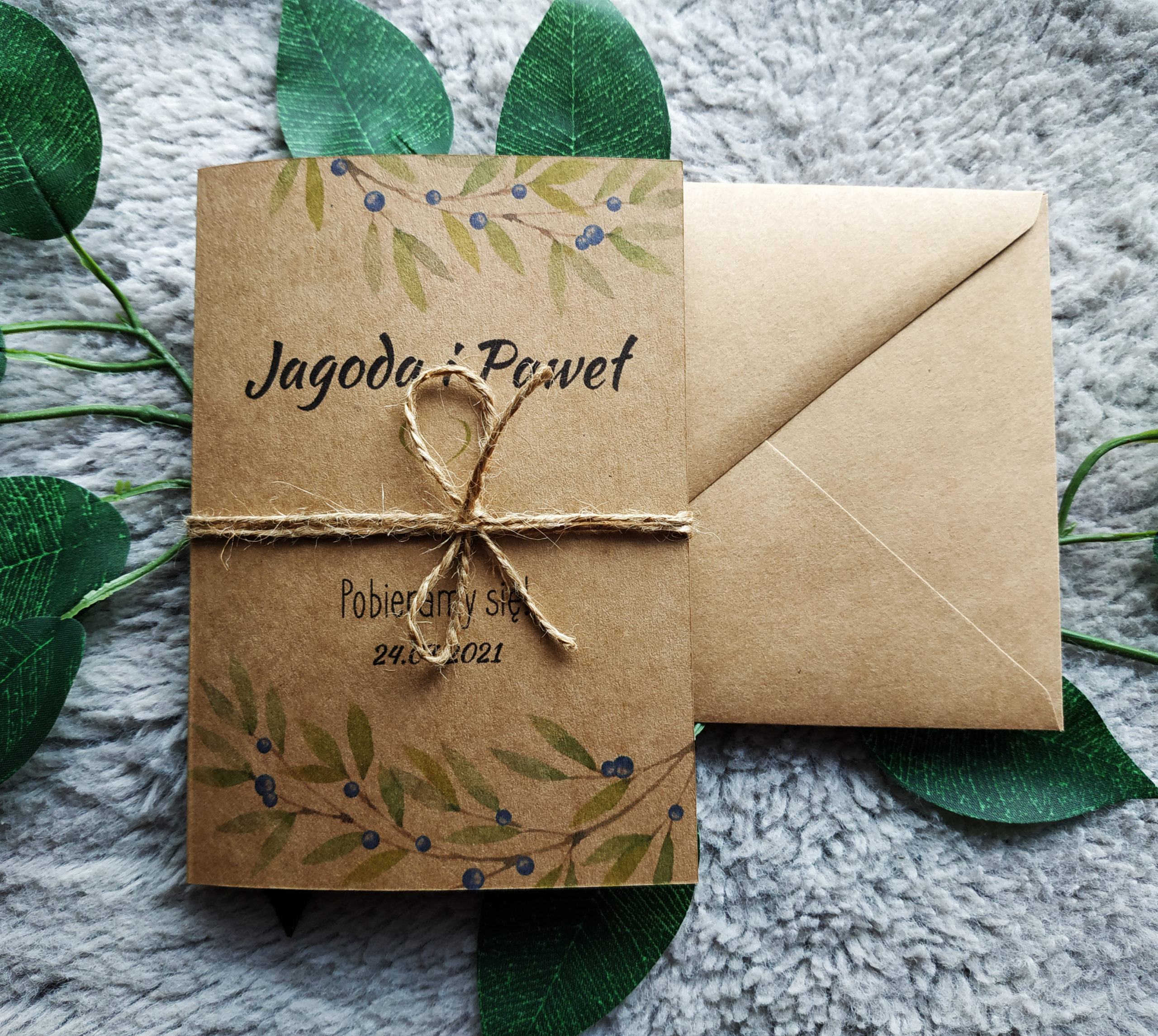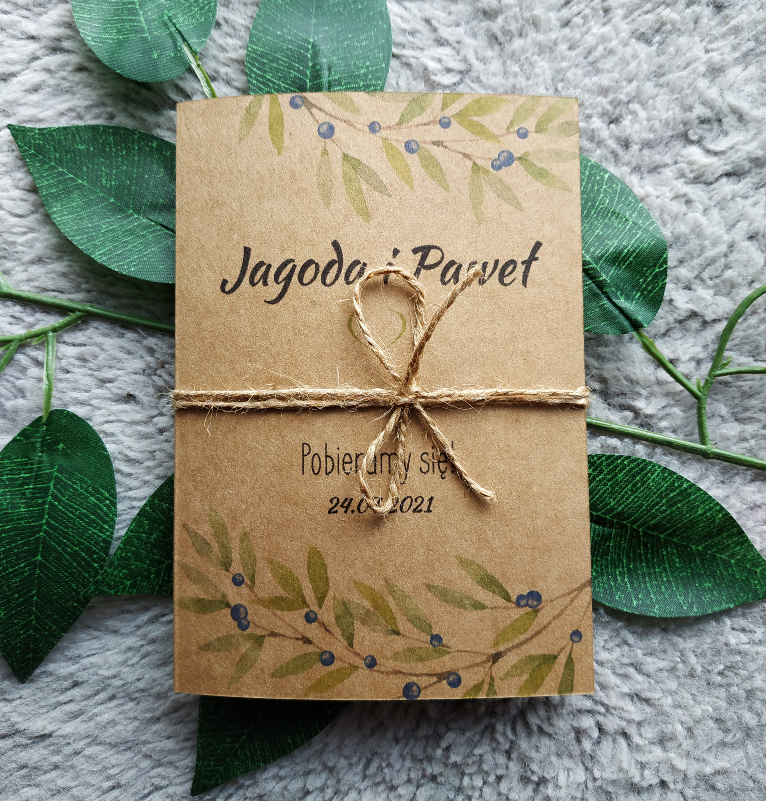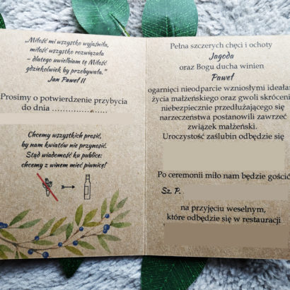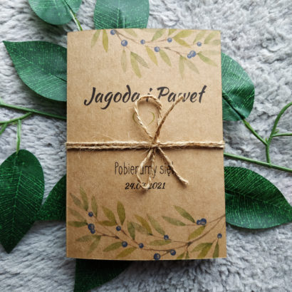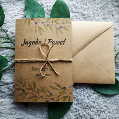 Zaproszenia w stylu boho. Wykonane na wysokiej jakości papierze ekologicznym. Na okładce znajduje się delikatny wzór gałązek z zielonymi listkami oraz delikatnymi owocami jagód.