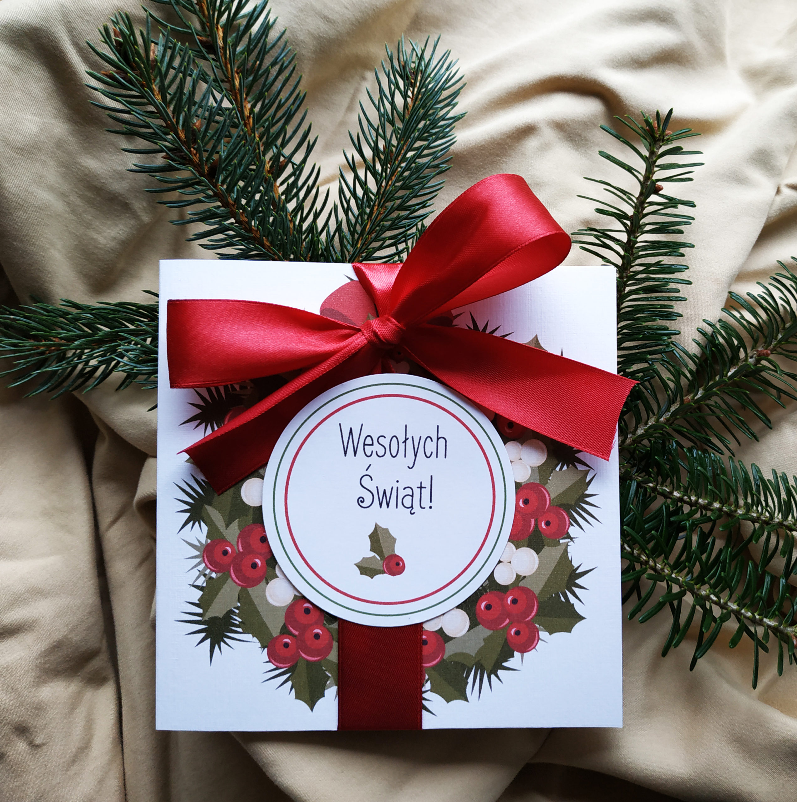 Kartka w formie kwadratu 14x14cm wykonana z białego papieru o fakturze płótna. Motyw bożonarodzeniowego wianka przewiązany ciemno-czerwoną satynową wstążką zawiązaną w kokradę. Na okładce kółeczko 3D a w nim napis „Wesołych Świąt!”. Treść życzeń a także napis na okładce można zmienić. Podana cena