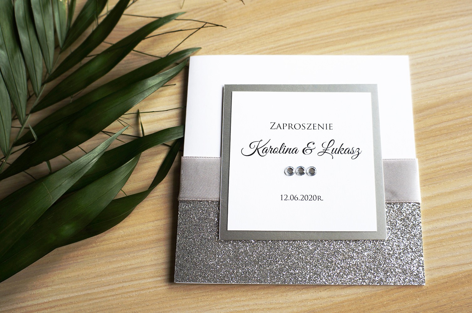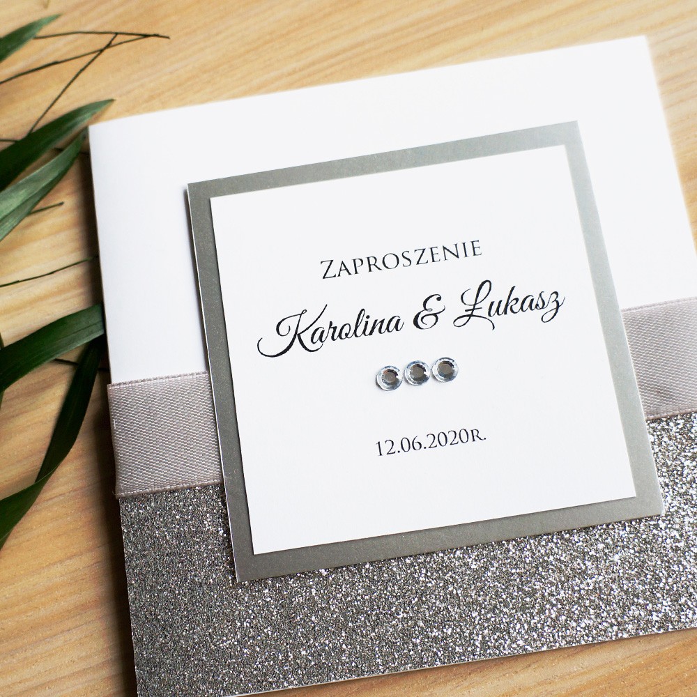 z białego gładkiego papieru, połączonego z błyszczącym brokatowym papierem. Okładka ozdobiona srebrną satynową wstążką. Na okładce widnieje napis „Zaproszenie” i/lub imiona Państwa Młodych + data ślubu, z dodatkiem błyszczących kryształków. Podana cena dotyczy 1 sztuki zaproszenia. Koperty sprzedawane osobno.
