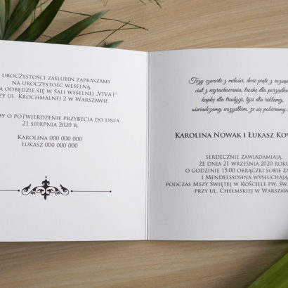 Zaproszenia z serii „Brokat” są pełne klasy i idealne dla par ceniących sobie elegancję. Zaproszenie w formie kwadratu o wymiarach 14x14cm wykonane