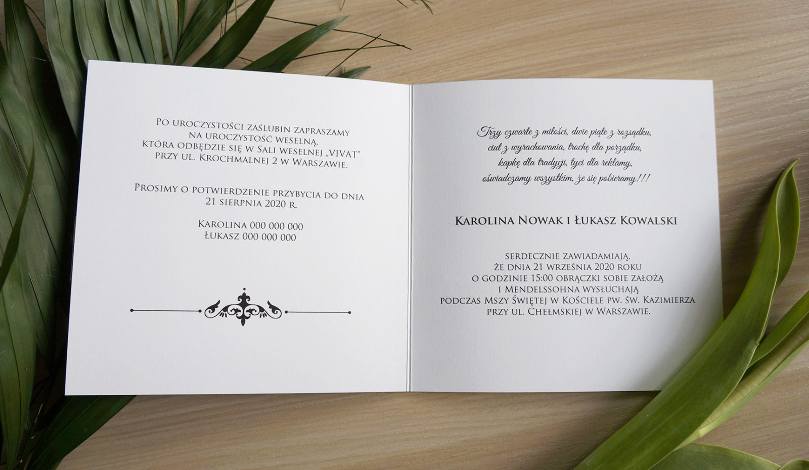– treść wnętrza: własna lub wybrana z zakładki „Treści do zaproszeń”,
