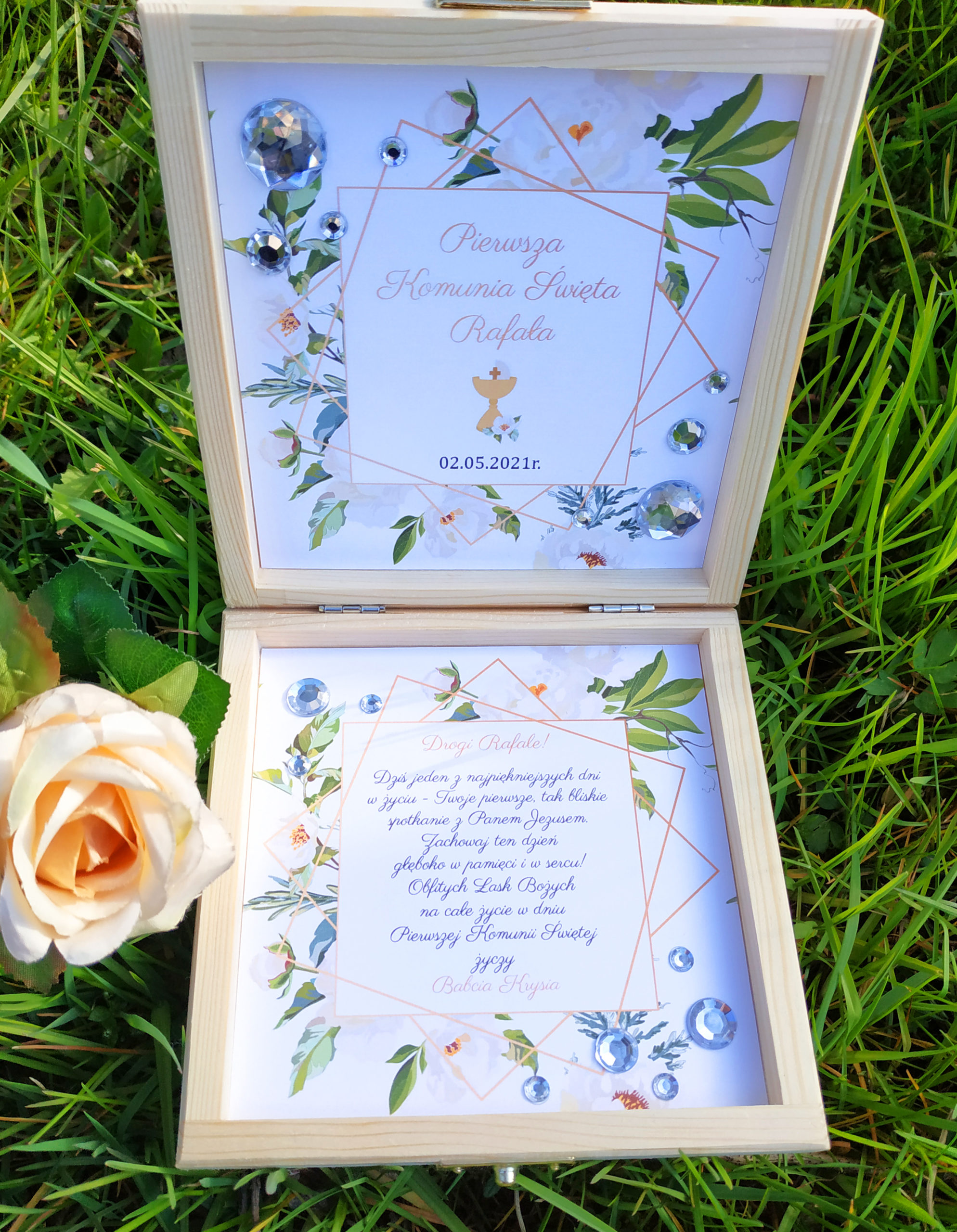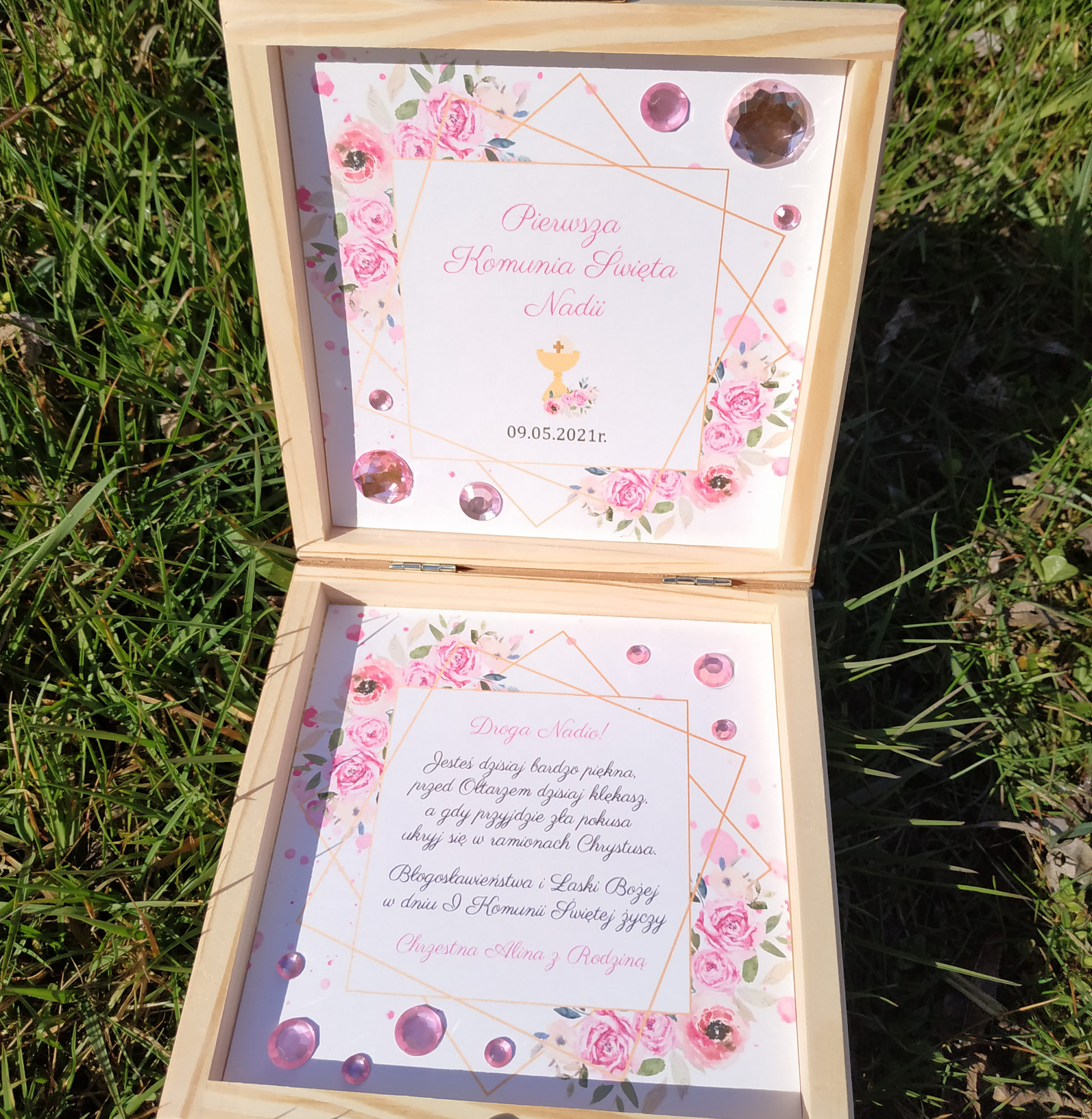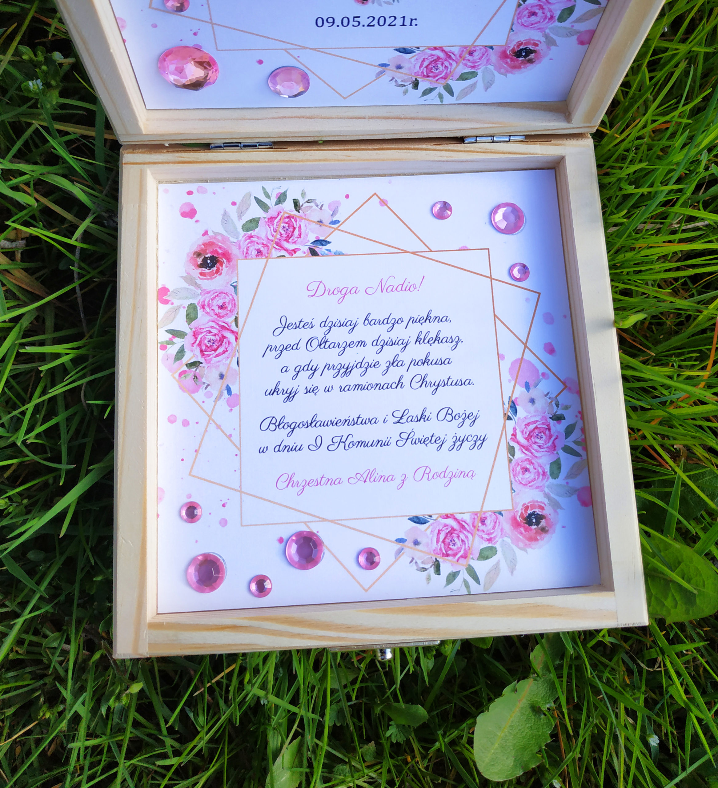Pamiątka Pierwszej Komunii Świętej w drewnianym pudełku z personalizowanym tekstem. Świetnie się sprawdzi jako prezent od Rodziców Chrzestnych. Pudełko ozdobione grafiką kwiatów oraz kryształkami. Zamykane na złoty zatrzask. Na wieczku ozdobny napis z grubej sklejki. Pudełko wykonane z naturalnego drewna sosnowego. Produkt NA ZAMÓWIENIE. Podana cena dotyczy 1 sztuki.