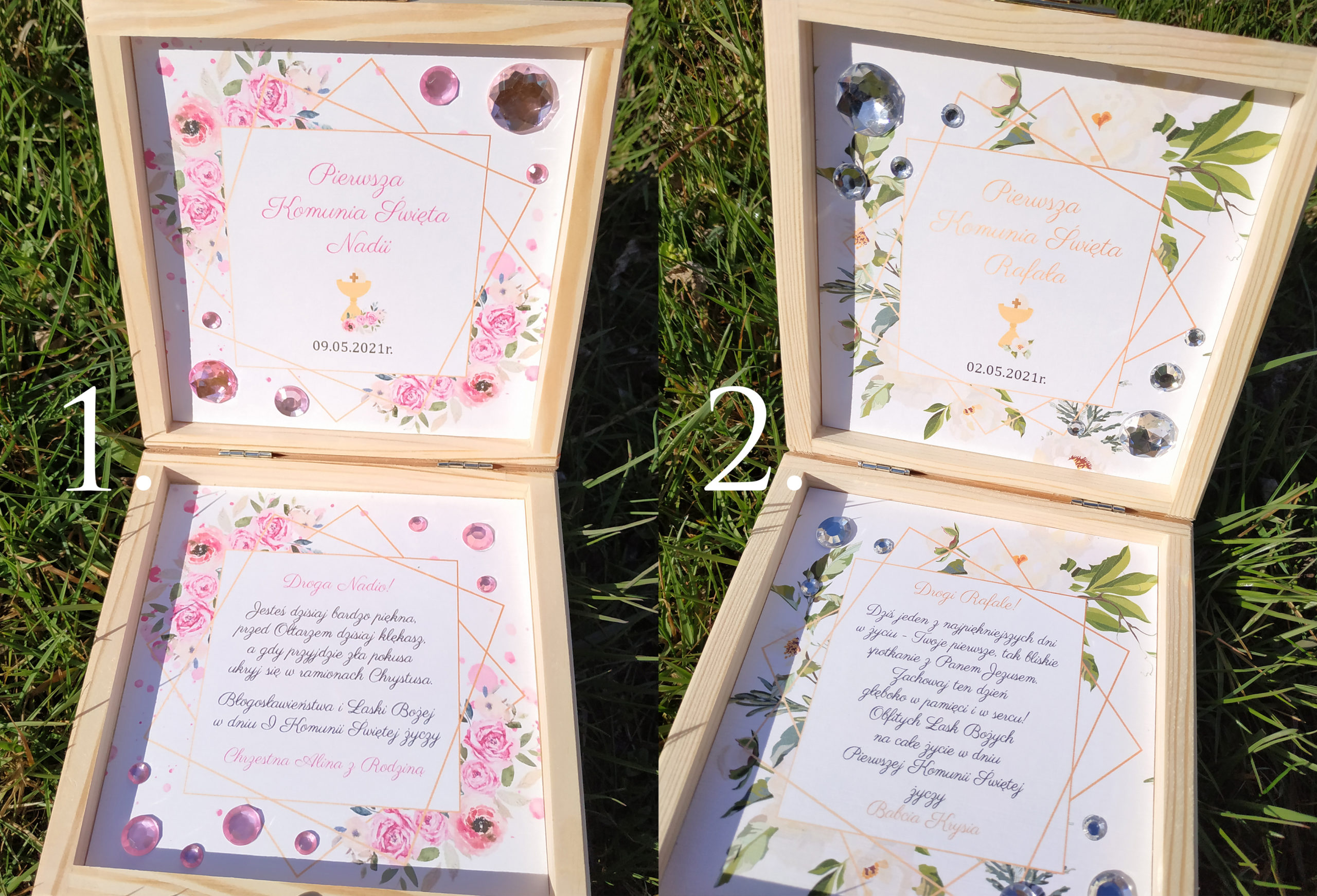 Drewniane pudełko to idealna pamiątka Pierwszej Komunii Świętej. Dostępna w dwóch wzorach!