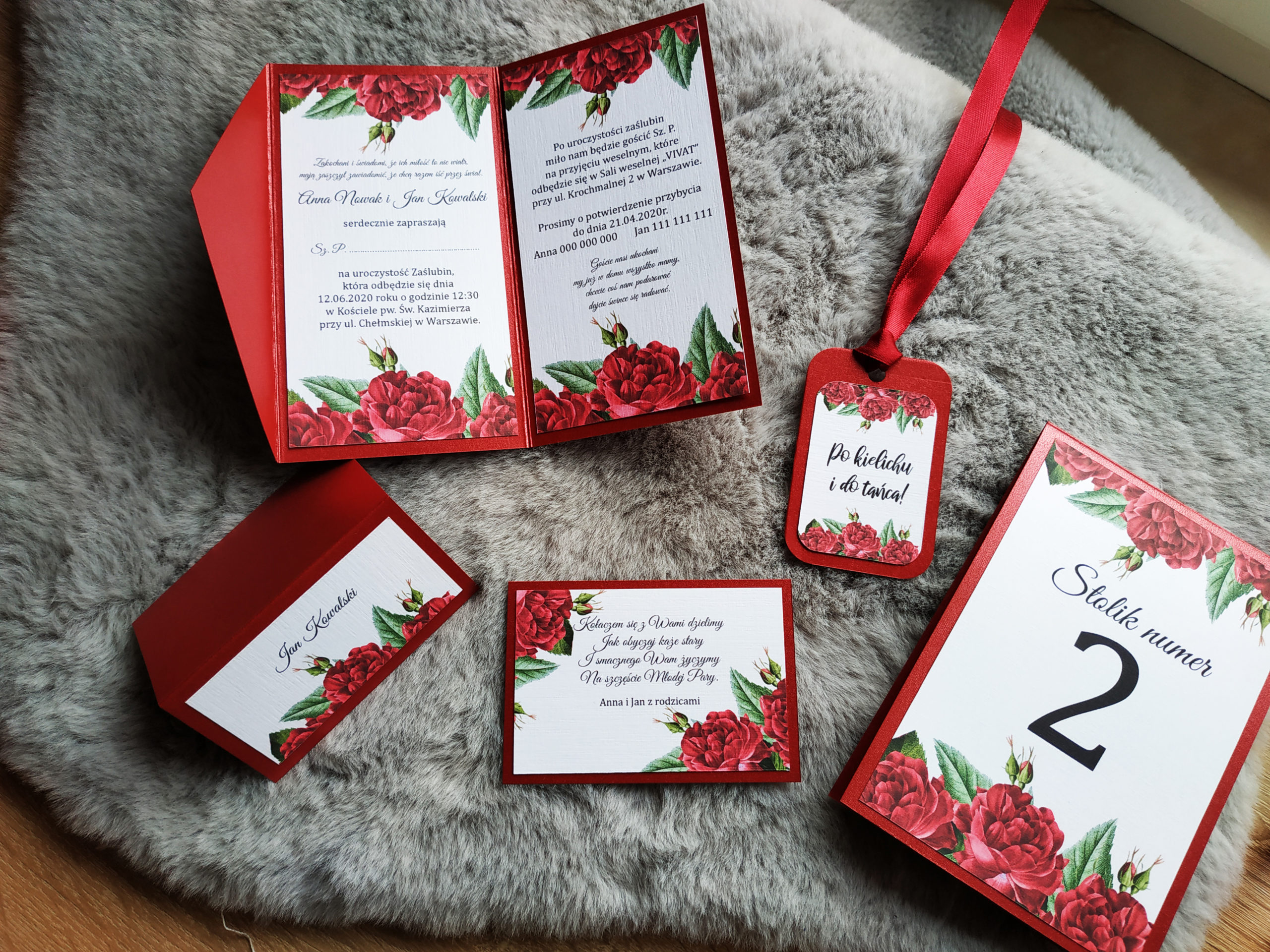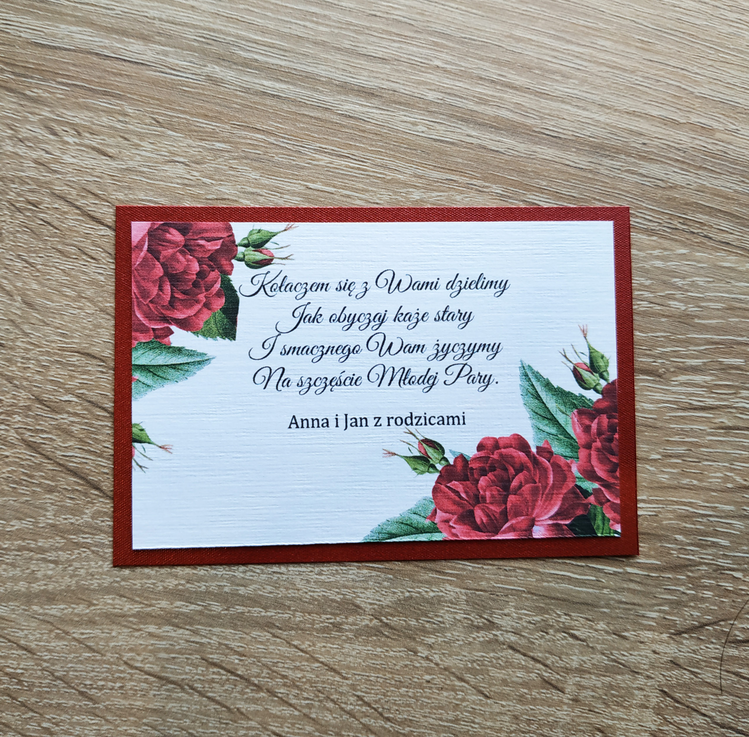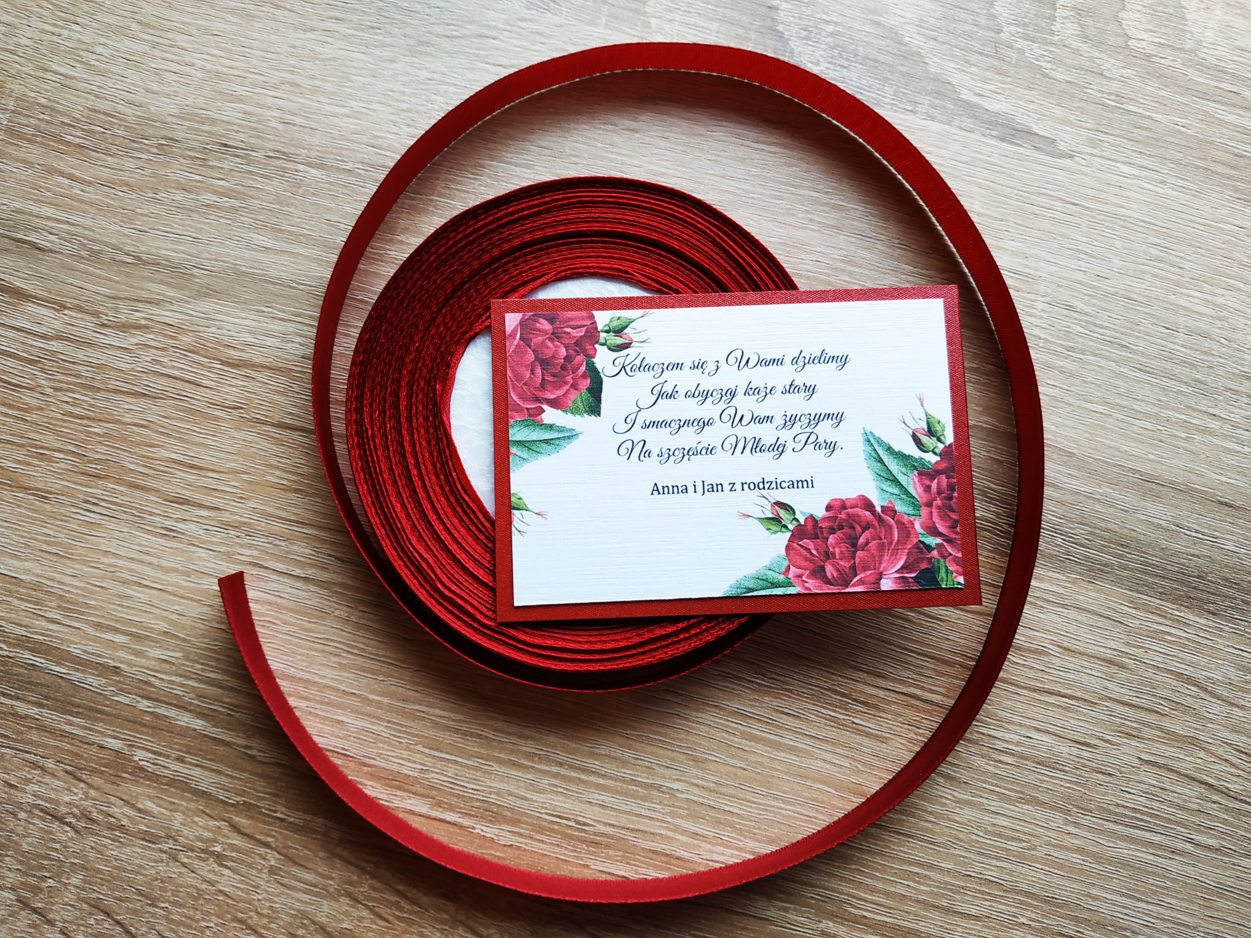 Elegancki karteczki dekoracyjne na ciasto i kołacz weselny z motywem czerwonych róż. Drukowane są na sztywnym papierze o fakturze płótna, następnie doklejane do czerwonego papieru o gramaturze 220g/m2.