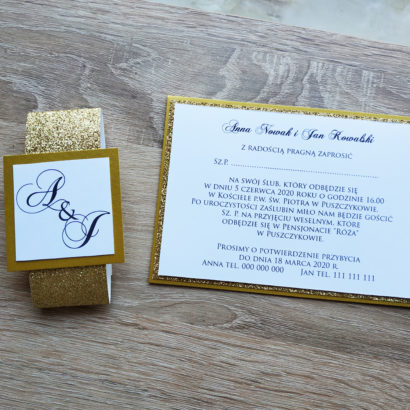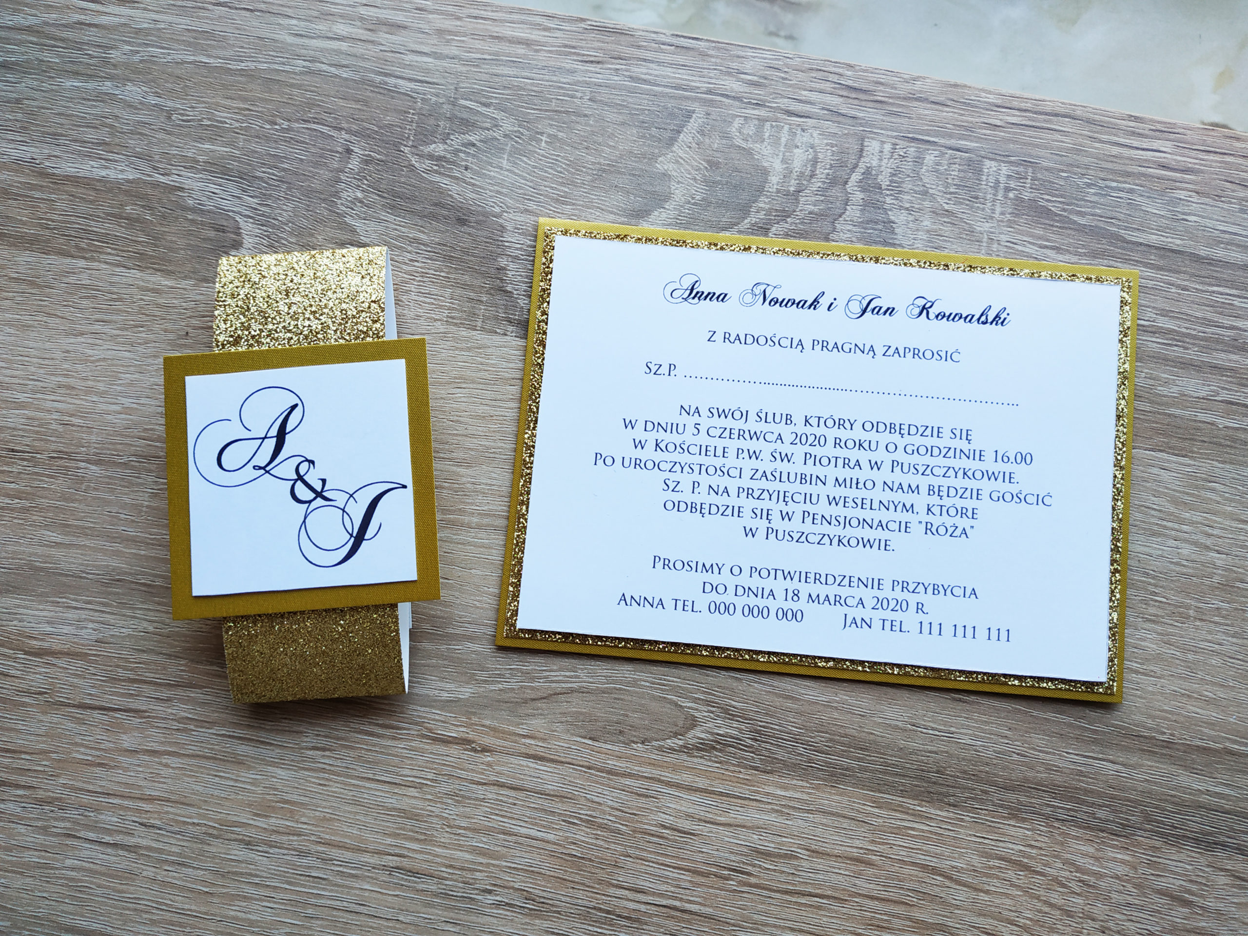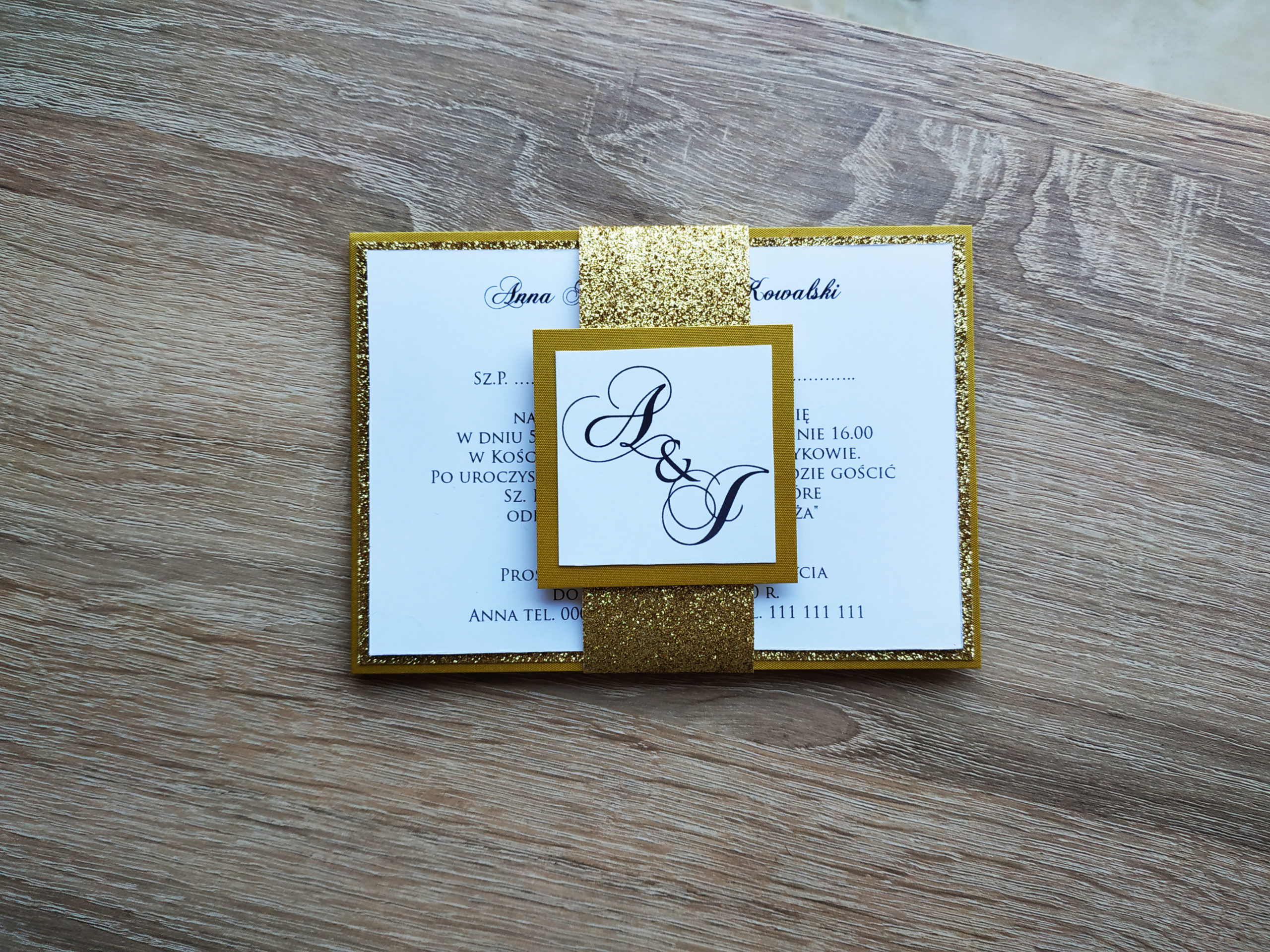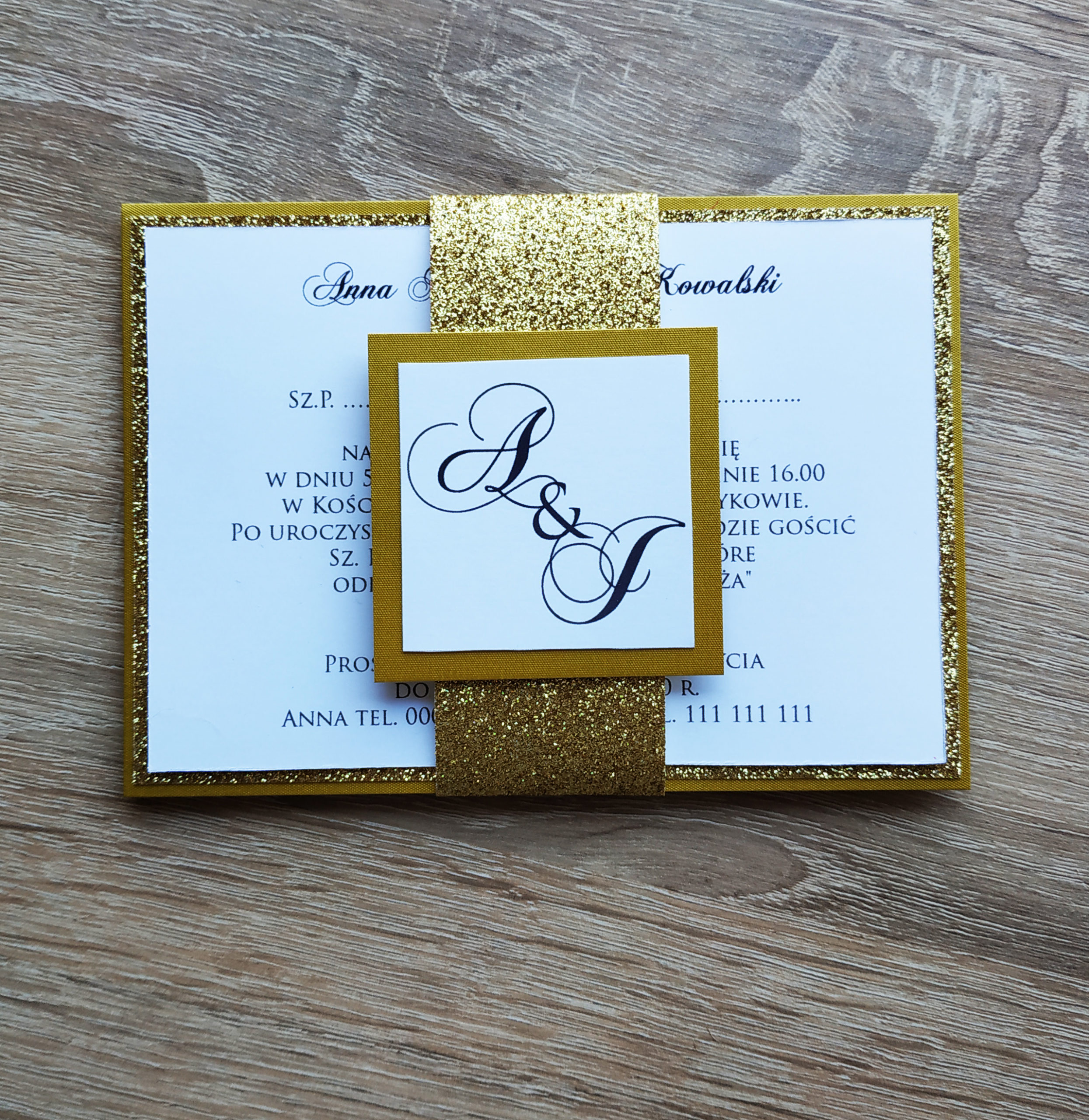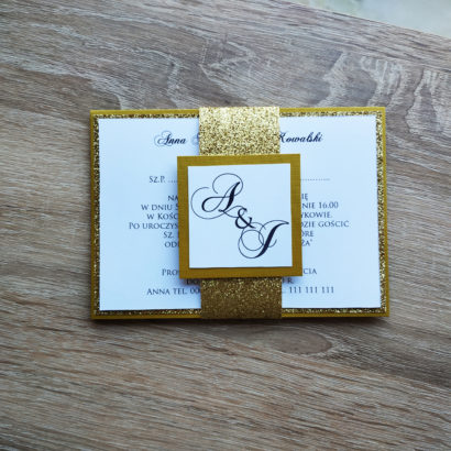 Olśniewające zaproszenie w stylu Glamour. Zaproszenie przepasane złotą opaską z dodatkiem kwadratu z inicjałami Państwa Młodych.