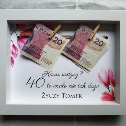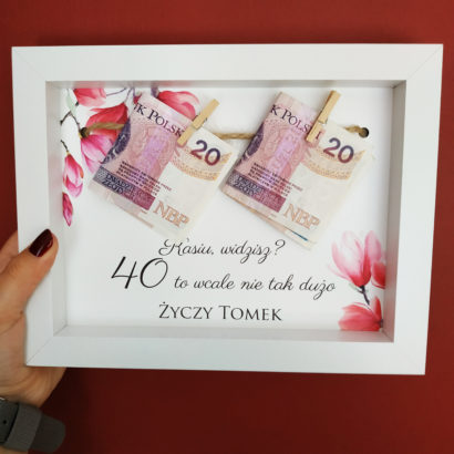 Prezentujemy ciekawy pomysł na prezent, białą ramkę 3D na banknoty z okazji okrągłych urodzin. Ramka stanowi śmieszny prezent. Pełna personalizacja! Ramkę można postawić lub zawiesić na ścianie. Możliwa zmiana grafiki. Masz własny pomysł? Napisz do nas, chętnie zrealizujemy! Banknoty na zdjęciu nie stanowią przedmiotu sprzedaży. Podana cena dotyczy 1 sztuki.