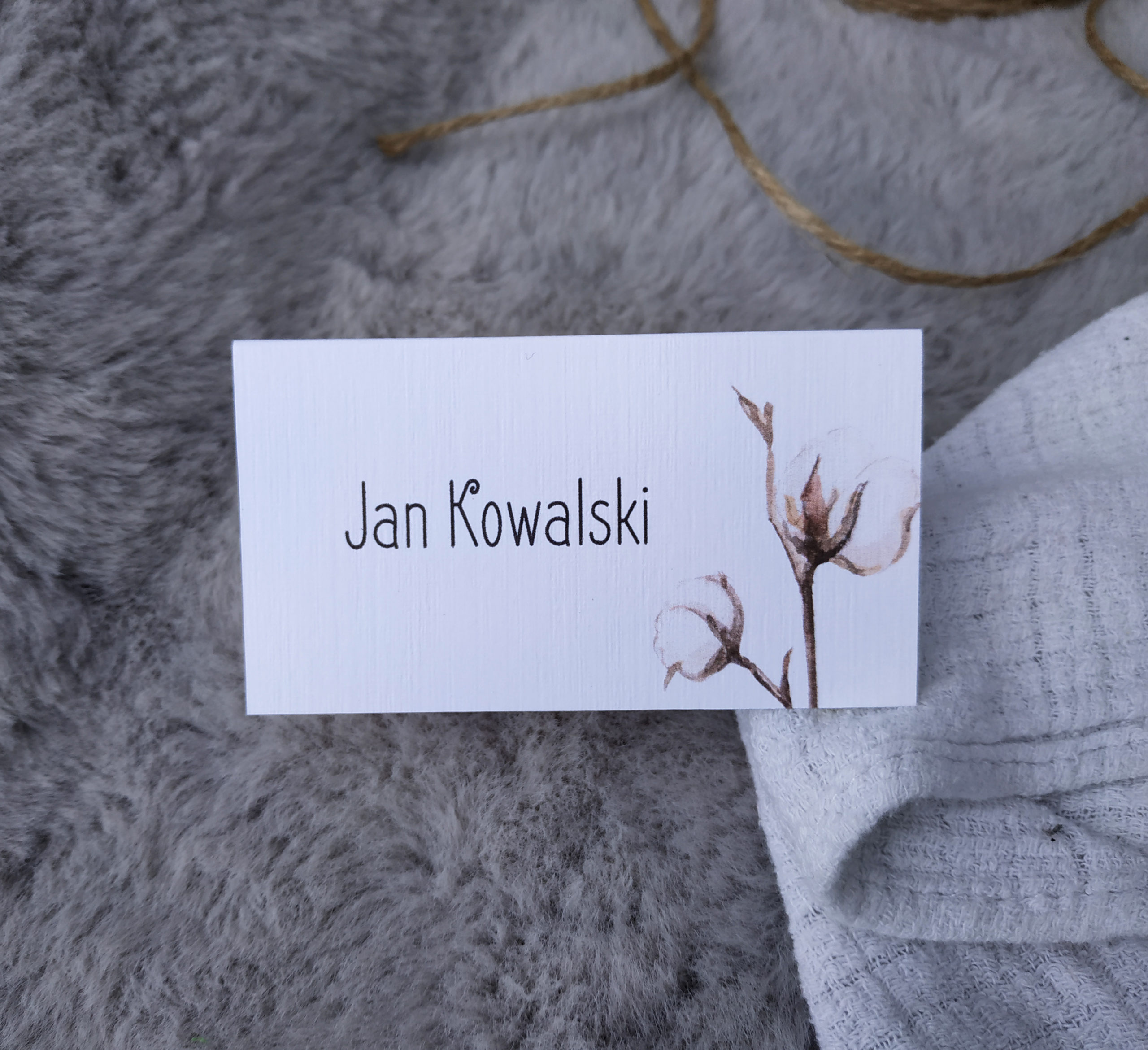 Minimalistyczna winietka, z kwiatem bawełny. Wykonana z białego papieru o fakturze płótna. Idealnie pasuje do zaproszeń kolekcji Kwiaty Bawełny. Podana cena dotyczy 1 sztuki winietki.