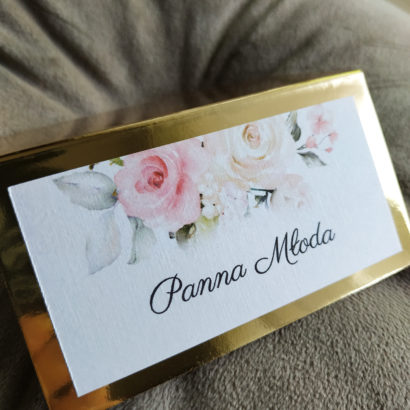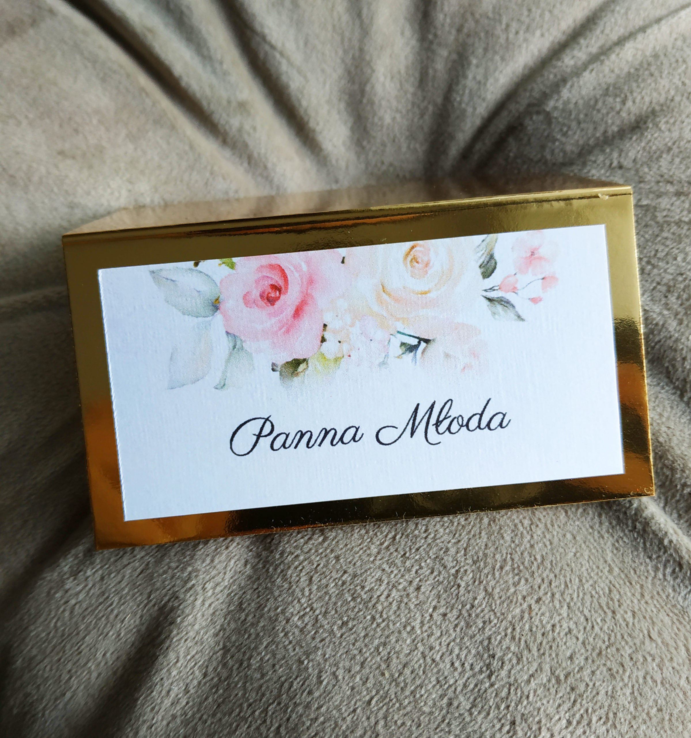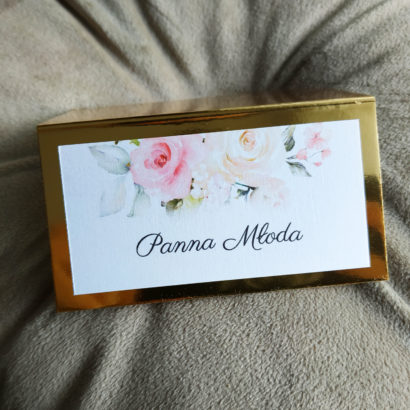 Winietka składa się z podkładki z złotego papieru oraz imienia i nazwiska gościa nadrukowanego na papier o fakturze płótna. Winietki z kolekcji Roses zawierają u góry piękne kwiaty róż w kolorze różu oraz ecru. Cudownie się komponują z pozostałymi dodatkami z tej serii, a także ożywią każdy stół. Są bardzo sztywne/twarde. Podana cena dotyczy 1 sztuki.