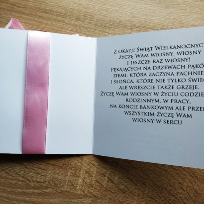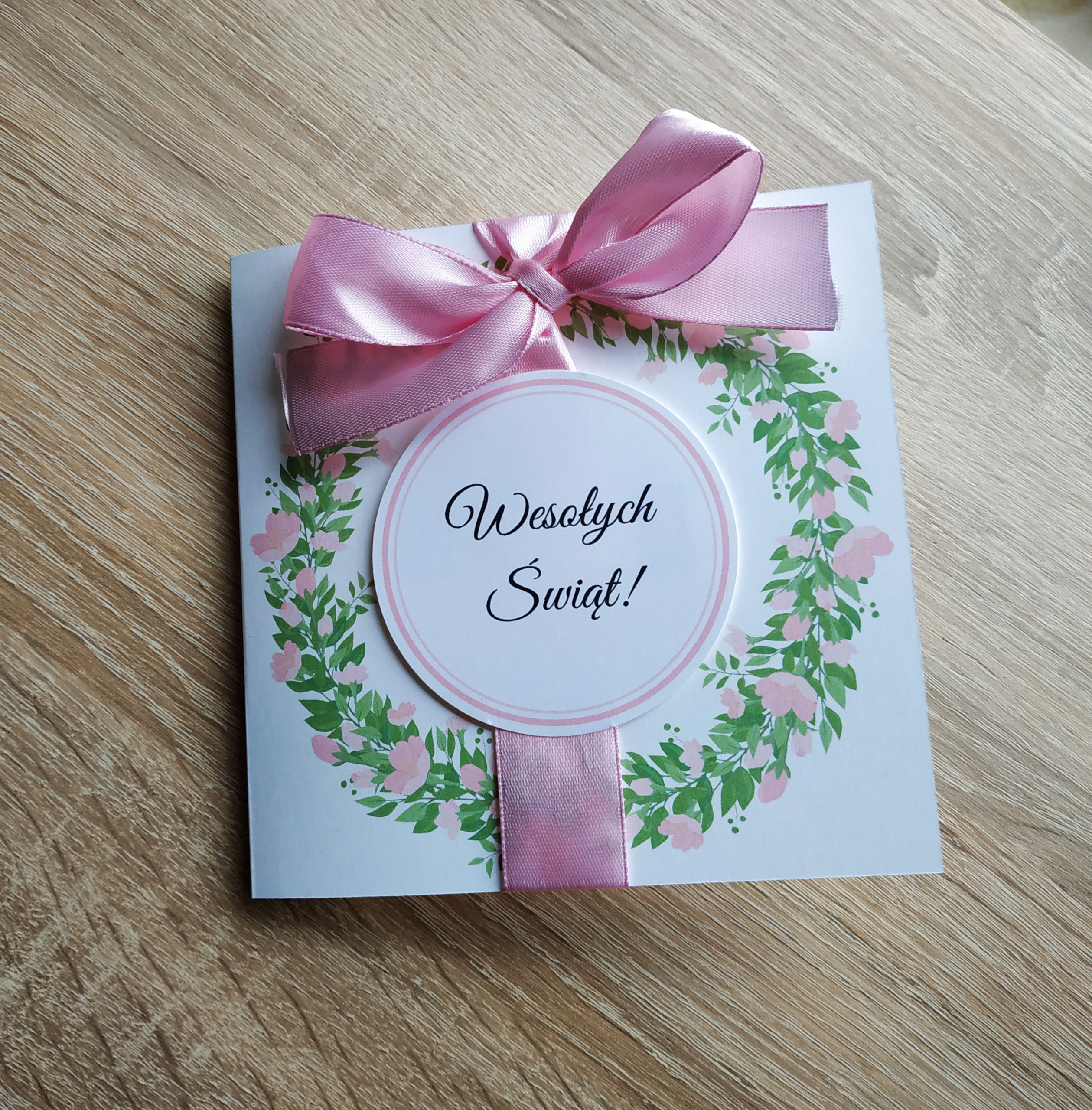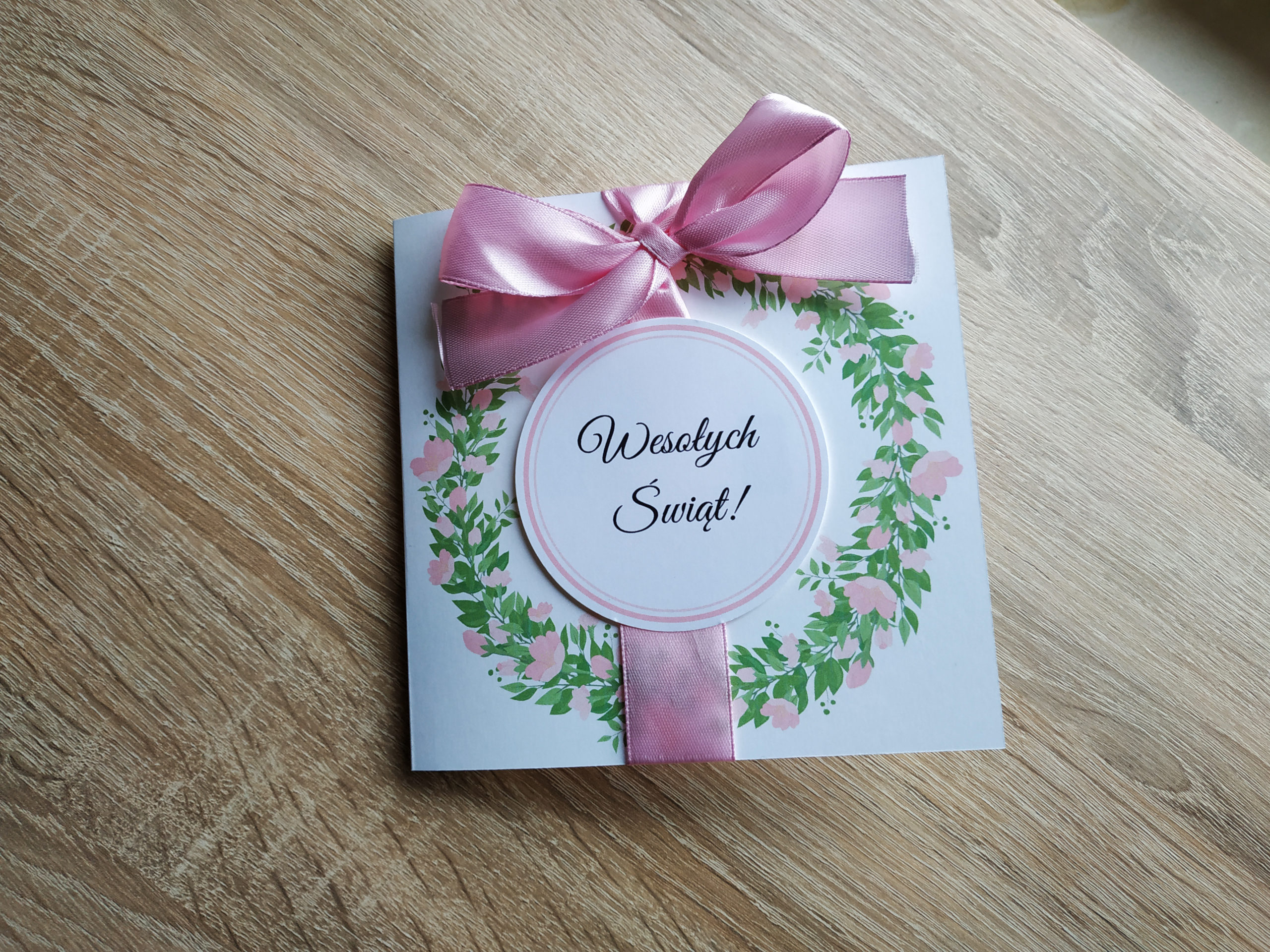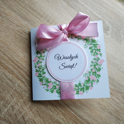 Kartka w formie kwadratu 14x14cm wykonana z białego gładkiego papieru. Motyw wiosennego wianka przewiązany różową satynową wstążką zawiązaną