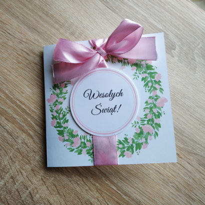 w kokradę. Na okładce kółeczko w różowej ramce a w nim napis „Wesołych Świąt!”. Treść życzeń a także napis na okładce można zmienić. Podana cena