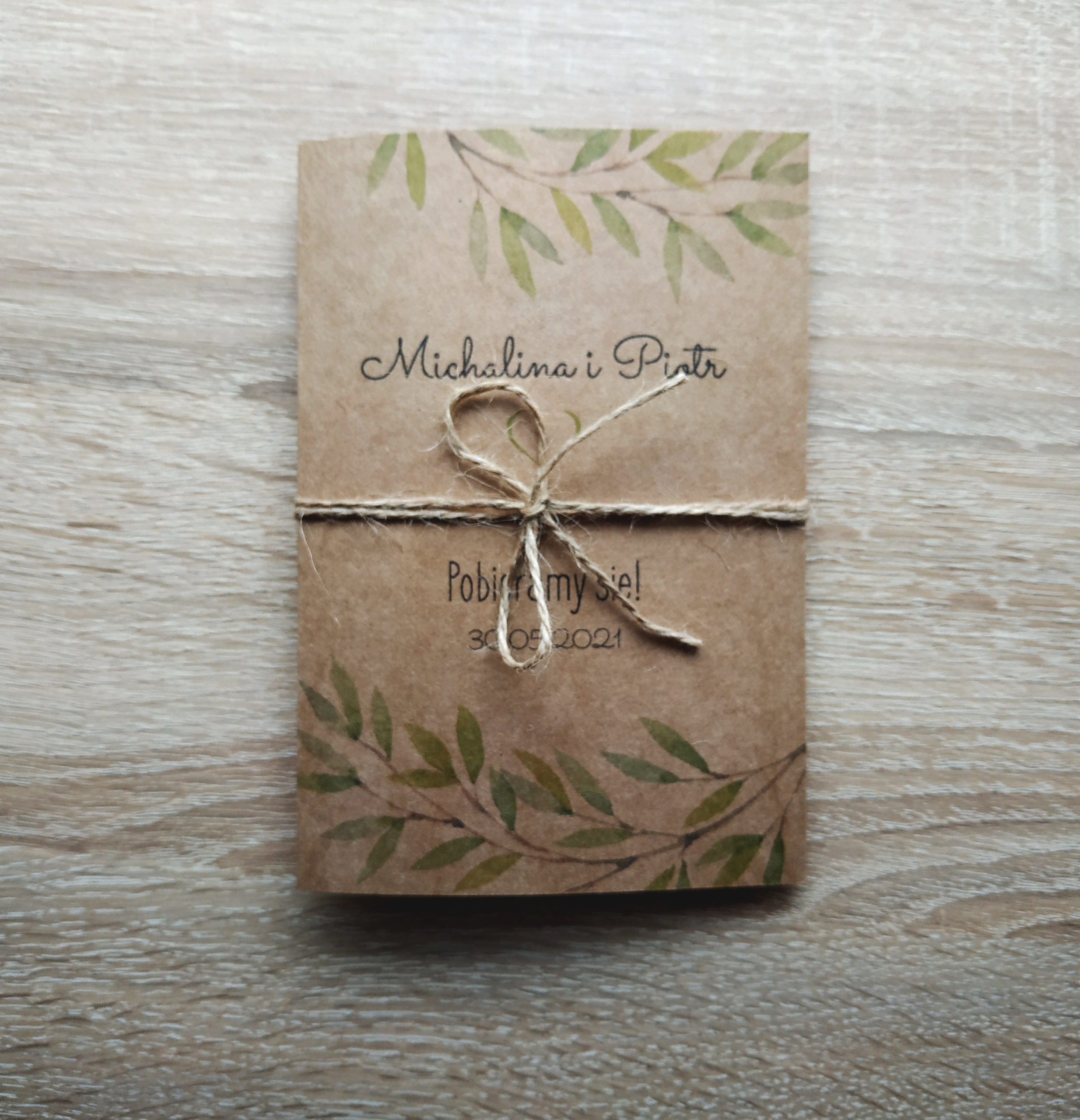 Zaproszenia w stylu boho. Wykonane na wysokiej jakości papierze ekologicznym. Na okładce znajduje się delikatny wzór gałązek z zielonymi listkami.
