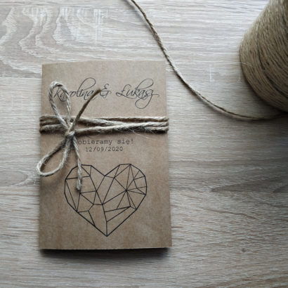 Nasze zaproszenia z geometrycznym sercem świetnie się wpasowują w wesela zorganizowane w stylu boho. Zaproszenie w formie prostokąta o wymiarach 14,2x10cm wykonane z ekologicznego papieru. Zaproszenie jest przewiązane sznurkiem jutowym, który jest zapleciony w kokardkę. A we wnętrzu znajdziecie wyjątkowe autorskie rebusy. Rebus to świetne rozwiązanie aby w subtelny sposób przekazać gościom, iż Młoda Para wolałaby w prezencie kopertę, wino lub zamiast kwiatów, karmę dla zwierzaków, którą później przekażą schronisku. Podana cena dotyczy 1 sztuki zaproszenia. Koperty sprzedawane osobno.