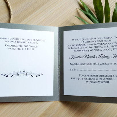 Zaproszenia z serii „Brokat” są pełne klasy i idealne dla par ceniących sobie elegancję. Zaproszenie w formie kwadratu o wymiarach 14x14cm wykonane
