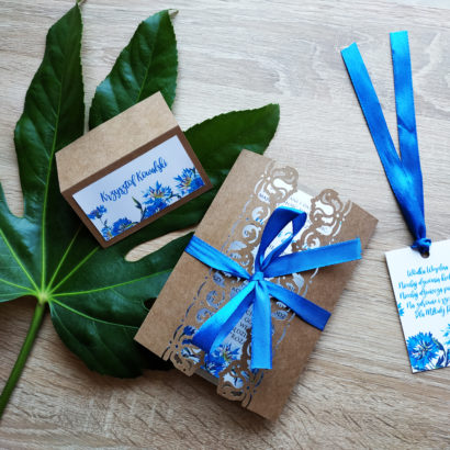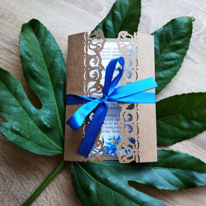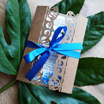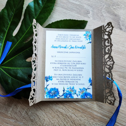 Zjawiskowe chabrowe zaproszenie z oryginalnym wycinanym wzorem, przewiązane cudowną granatową wstążką. Idealne dla fanów letnich kwiatów.