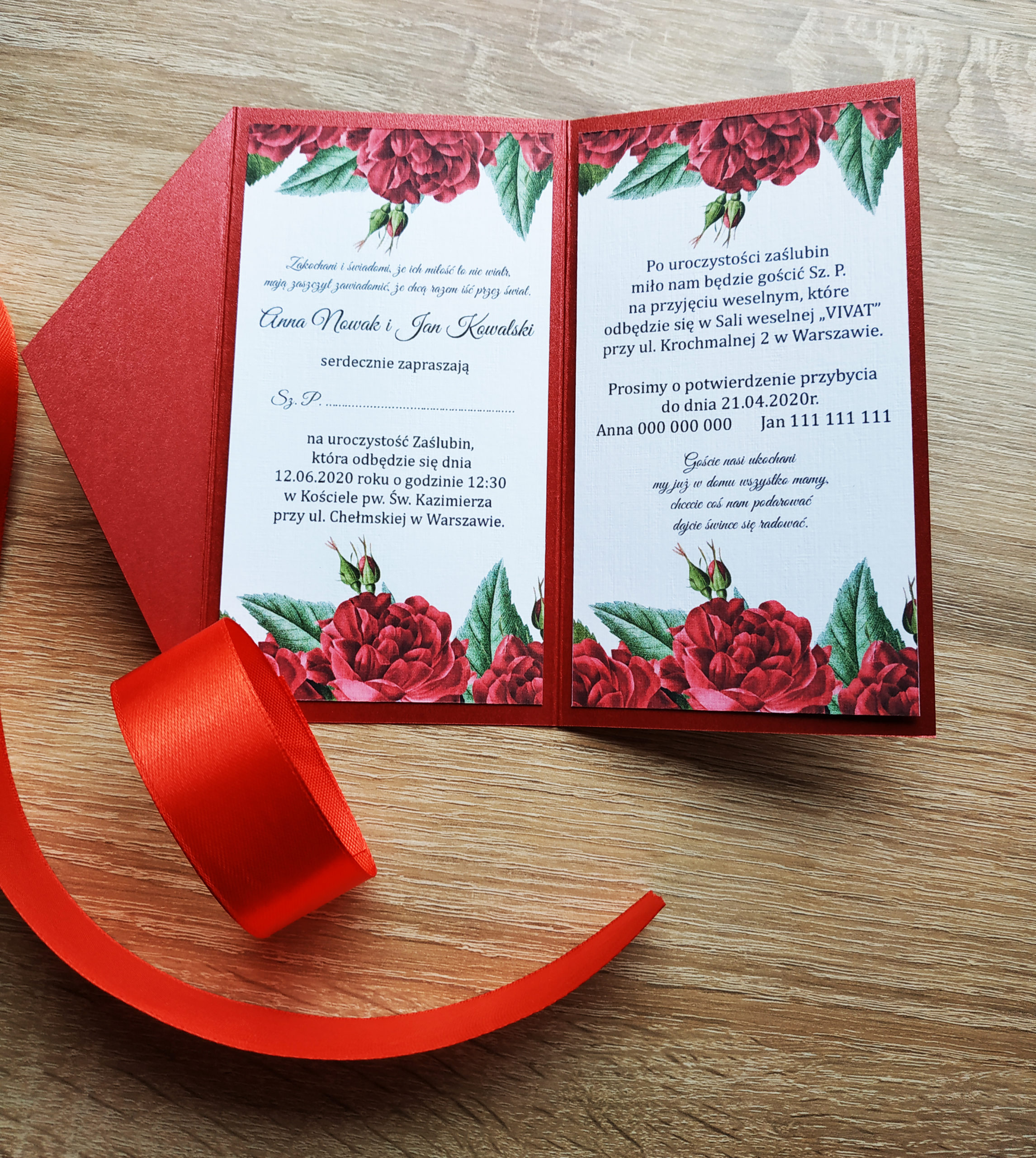 Przepiękne i eleganckie zaproszenie z kolekcji Czerwień róż. Tę kolekcję charakteryzują ciepłe żywe kolory a także najpiękniejsze kwiaty świata – róże! Całość jest zawarta w formie koperty, a elegancji dodaje szeroka jasno-czerwona wstążka.