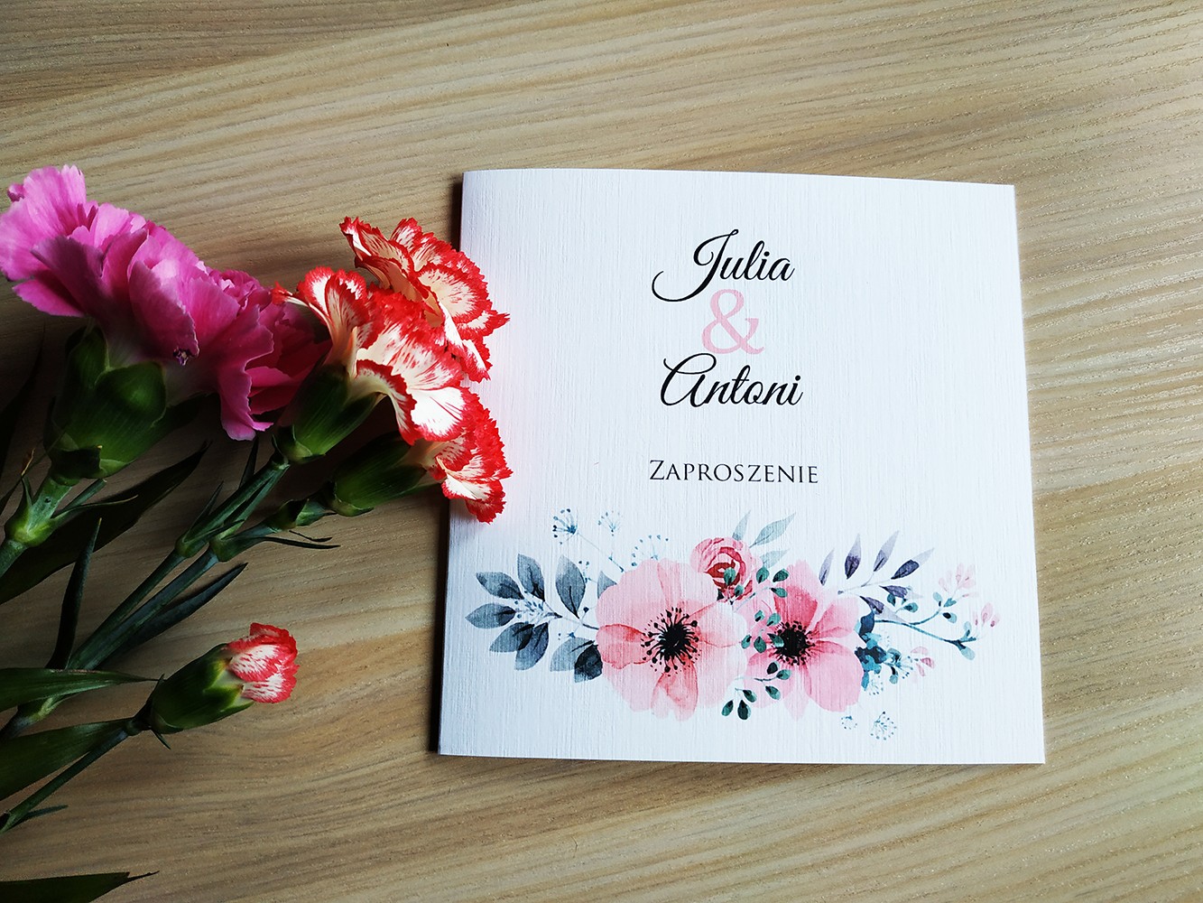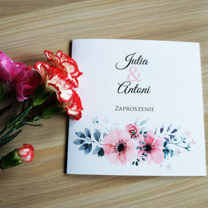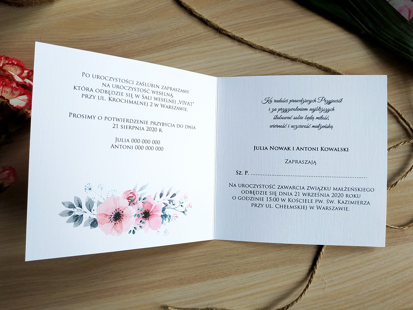 Minimalistyczne zaproszenie w kształcie kwadratu, na papierze o fakturze płótna. Na okładce delikatne różowe kwiaty. Idealne dla fanów prostoty, a zarazem pełne uroku. Świetnie się sprawdzi jako zaproszenie na urodziny lub wesele.