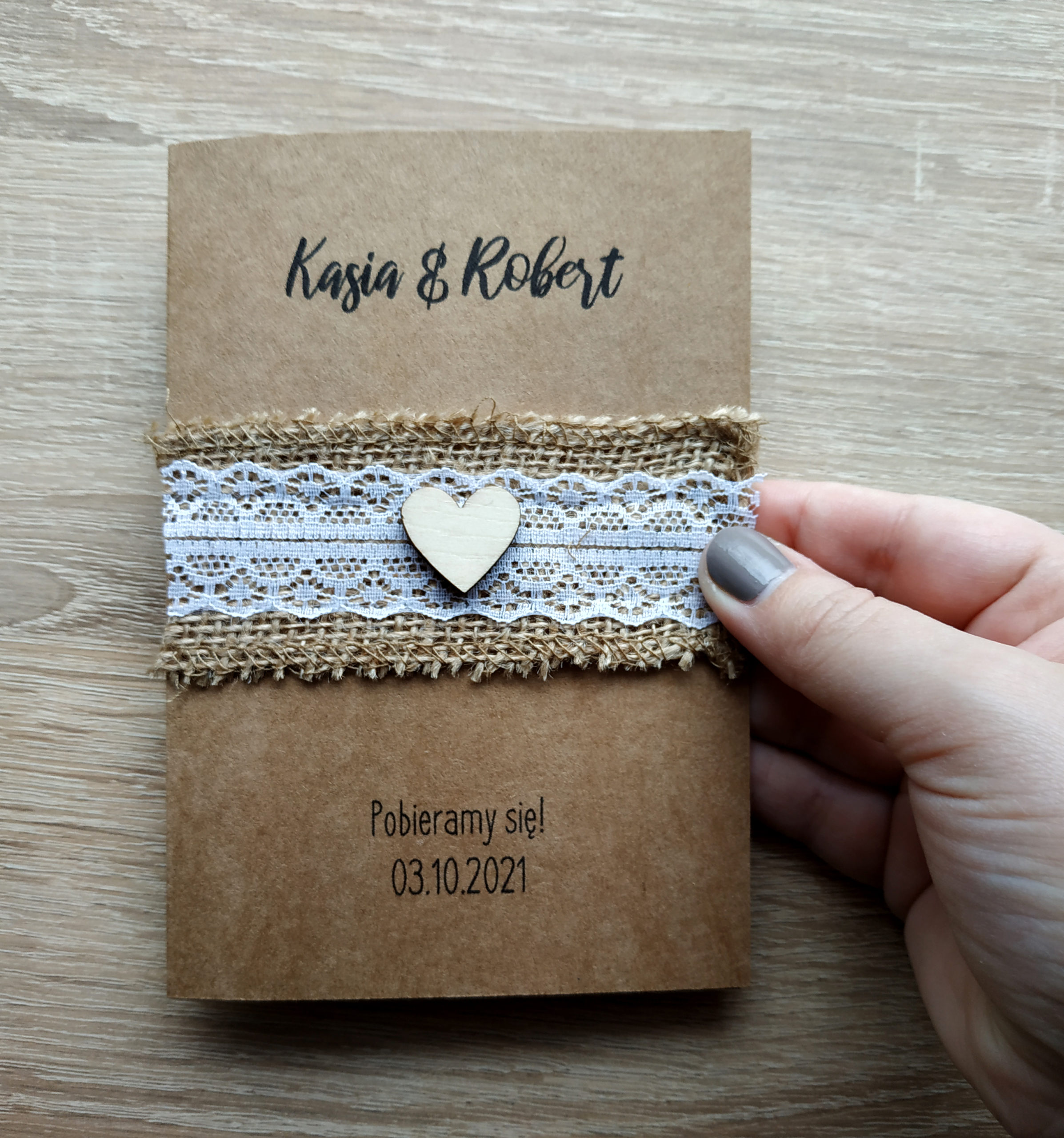 Zaproszenia w stylu boho. Wykonane na wysokiej jakości papierze ekologicznym. Na okładce znajduje się wstążka z juty, ozdobiona białą koronką. Całości dopełnia małe drewniane serduszko wykonane z drewna.