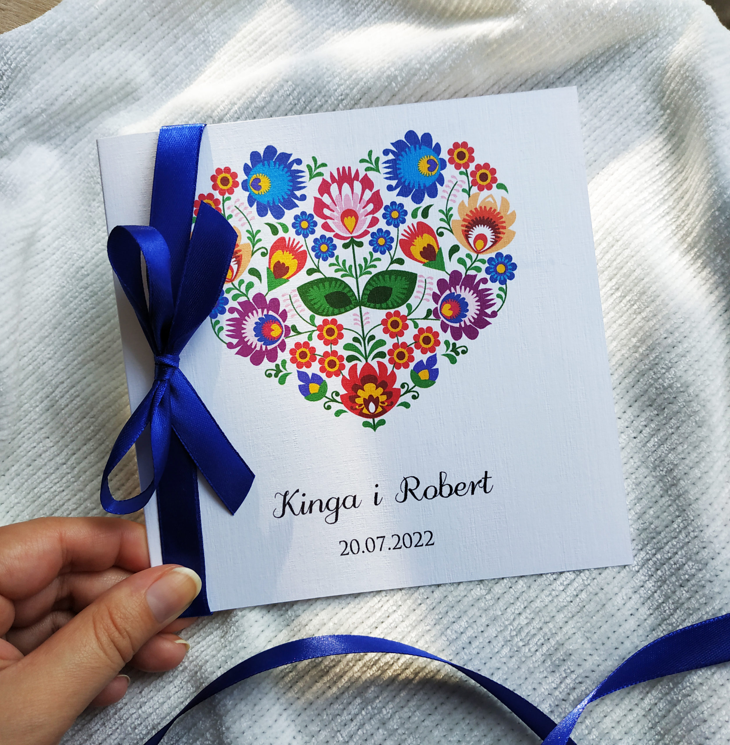 Zaproszenie w stylu folk z piękną grafiką ludowych wzorów ujętych w kształt serce. Całość przewiązana satynową wstążką w intensywnym kolorze. Podana cena dotyczy 1 sztuki zaproszenia. Koperty sprzedawane osobno. Pięknie się prezentuje z kolorową kopertą.