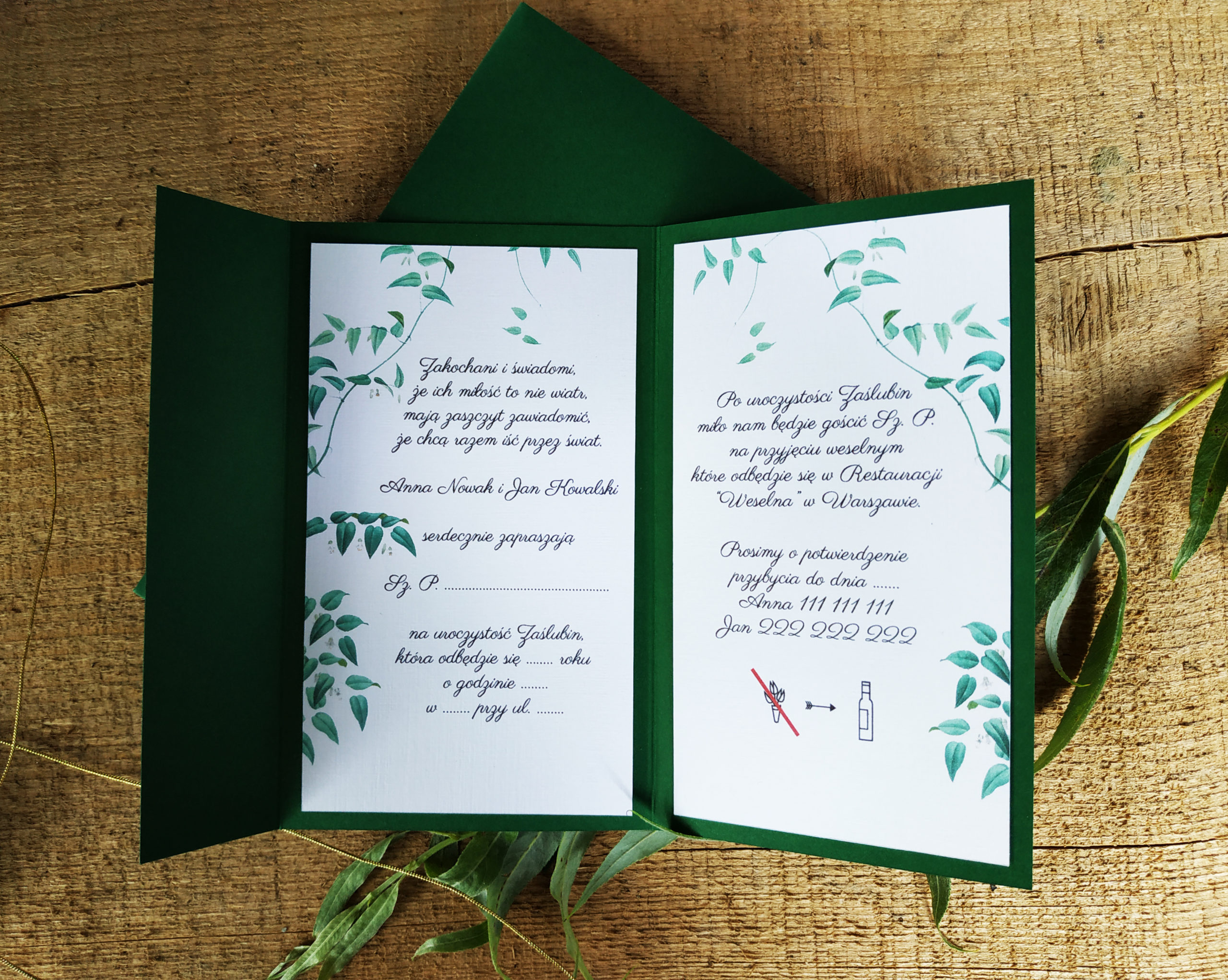Minimalistyczne zaproszenie z motywem zielonych liści, wykonane na podkładce z papieru w kolorze butelkowej zieleni. Przewiązane złotym/srebrnym cienkim sznurkiem. Bardzo eleganckie i nowoczesne. Możliwość zakupu koperty w kolorze butelkowej zieleni. Podana cena dotyczy 1 sztuki zaproszenia.