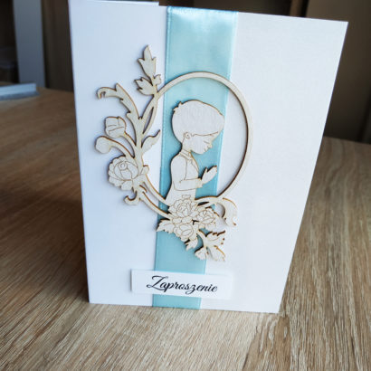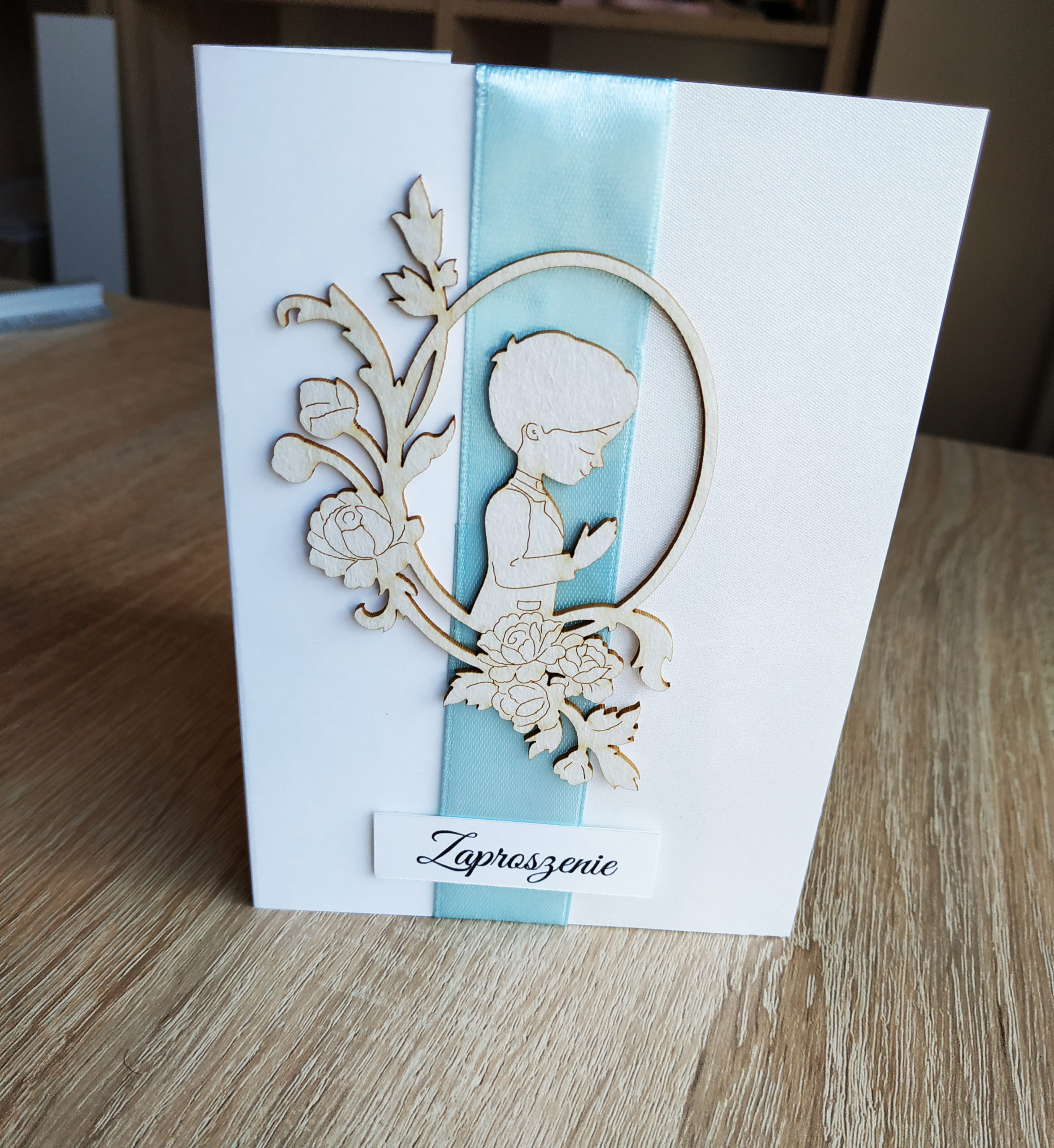 Zaproszenie w formie prostokąta o wymiarach 14x10cm wykonane z białego gładkiego papieru, w połączeniu z papierem diamentowym. Przewiązane niebieską wstążką. Na okładce w pięknej wycinanej ramce jest ukazana modląca się postać chłopca. W cenie pełna personalizacja. Możliwość wyboru czcionki oraz zmiana tekstu we wnętrzu. Cena dotyczy 1 sztuki zaproszenia. Koperta biała C6 GRATIS.