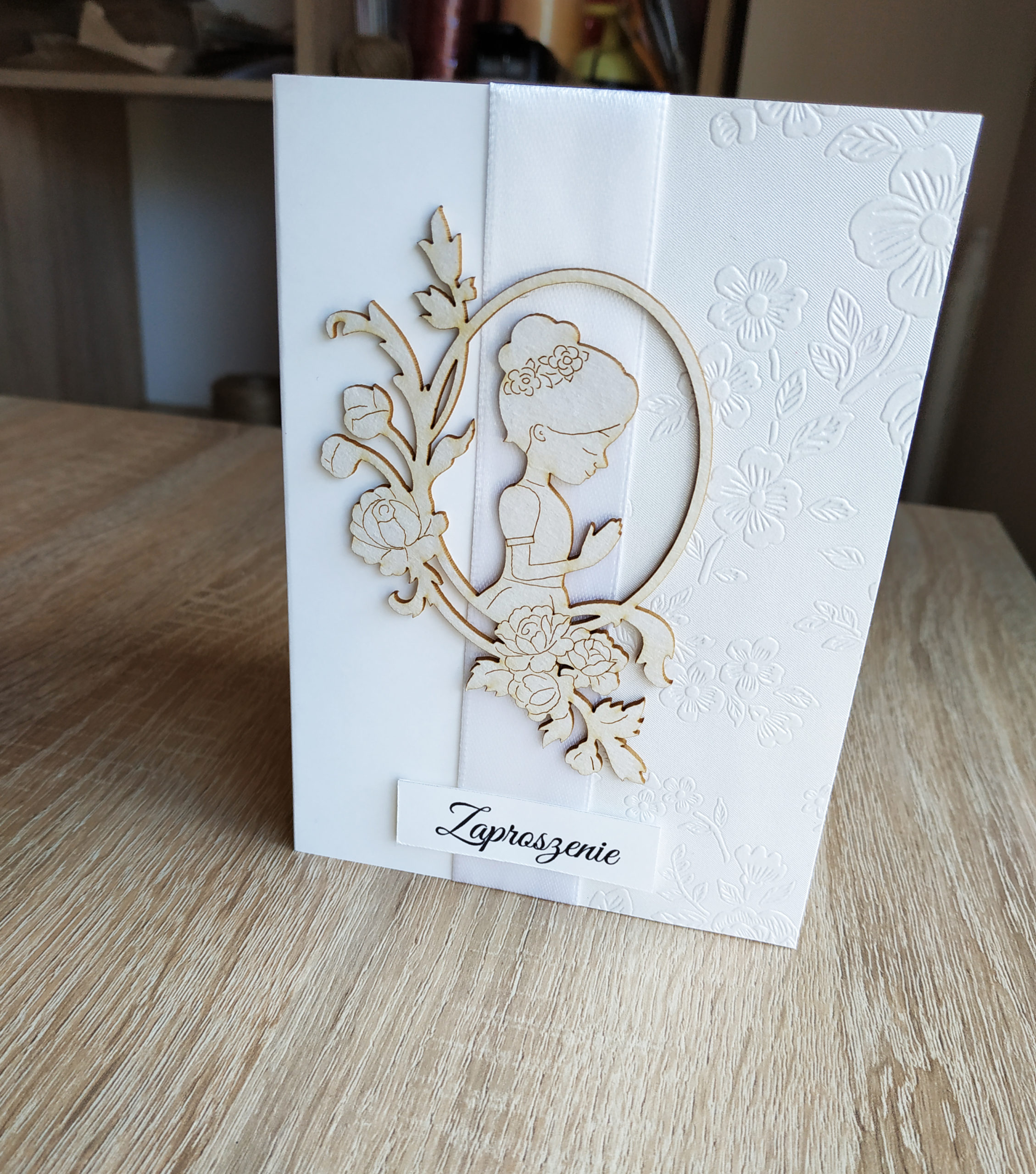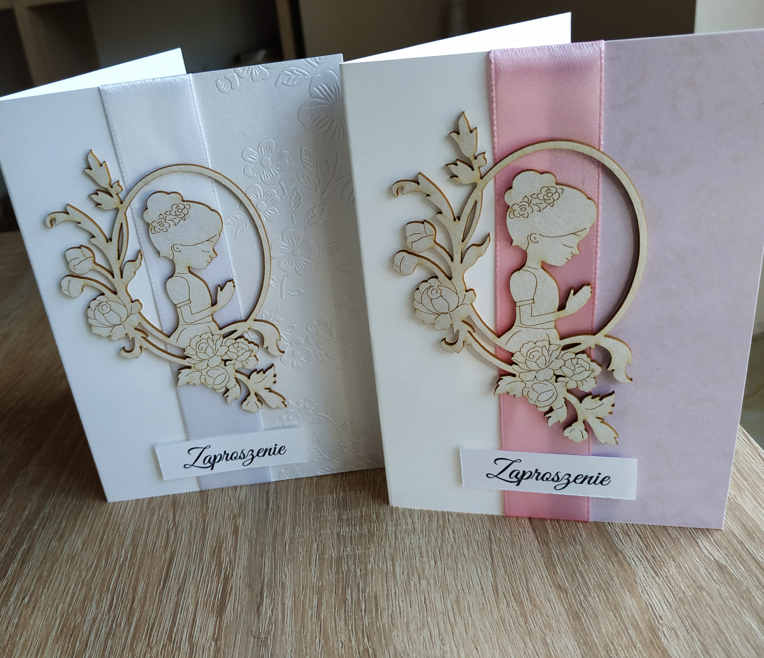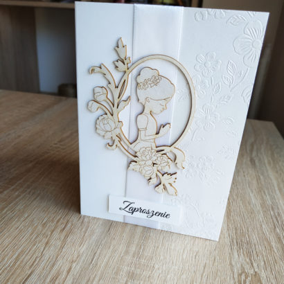 Zaproszenie w formie prostokąta o wymiarach 14x10cm wykonane z białego gładkiego papieru, w połączeniu z papierem w białe kwiaty. Przewiązane białą wstążką. Na okładce w pięknej wycinanej ramce jest ukazana modląca się postać dziewczynki. W cenie pełna personalizacja. Możliwość wyboru czcionki oraz zmiana tekstu we wnętrzu. Cena dotyczy 1 sztuki zaproszenia. Koperta biała C6 GRATIS.