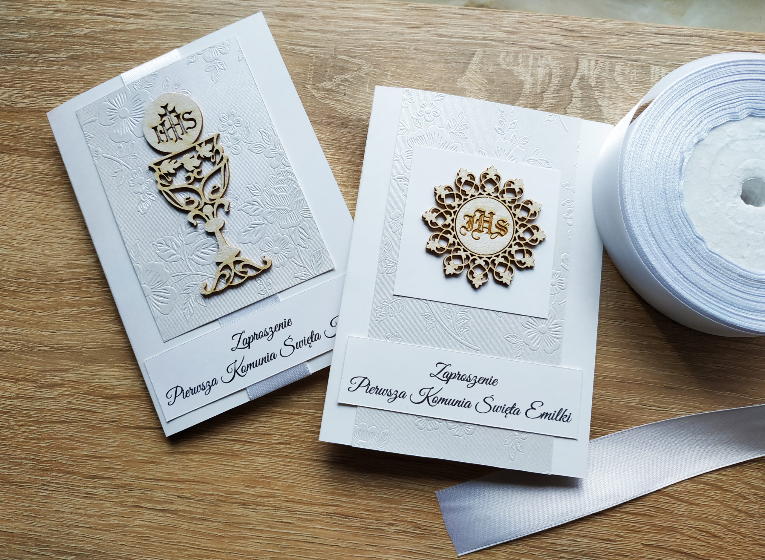 Zaproszenie w formie prostokąta o wymiarach 14x10cm wykonane z białego gładkiego papieru, w połączeniu z papierem w białe kwiaty. Przewiązane białą wstążką. Na okładce w piękny wycinany kielich z hostią. W cenie pełna personalizacja. Możliwość wyboru czcionki oraz zmiana tekstu we wnętrzu. Cena dotyczy 1 sztuki zaproszenia. Koperta biała C6 GRATIS.