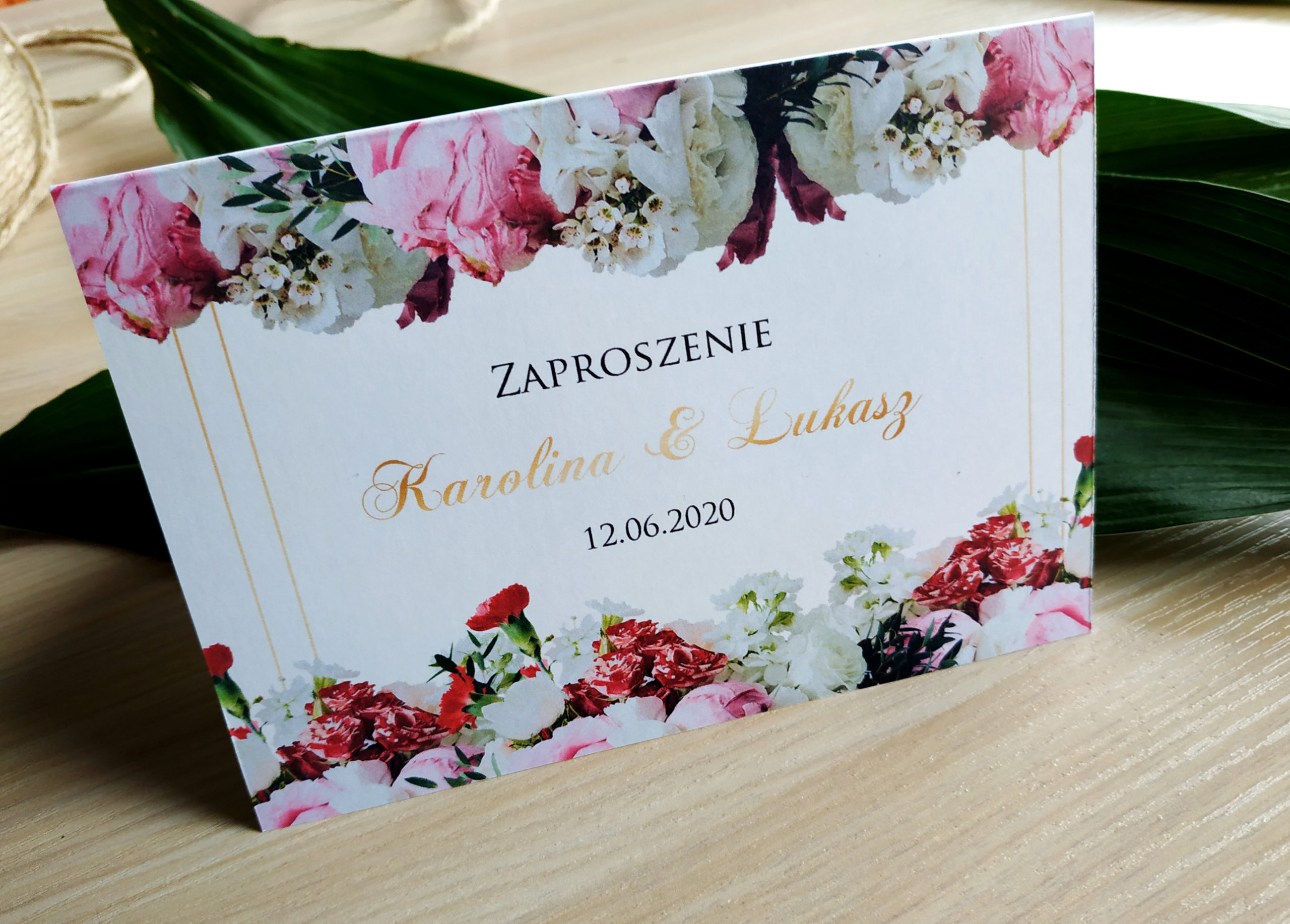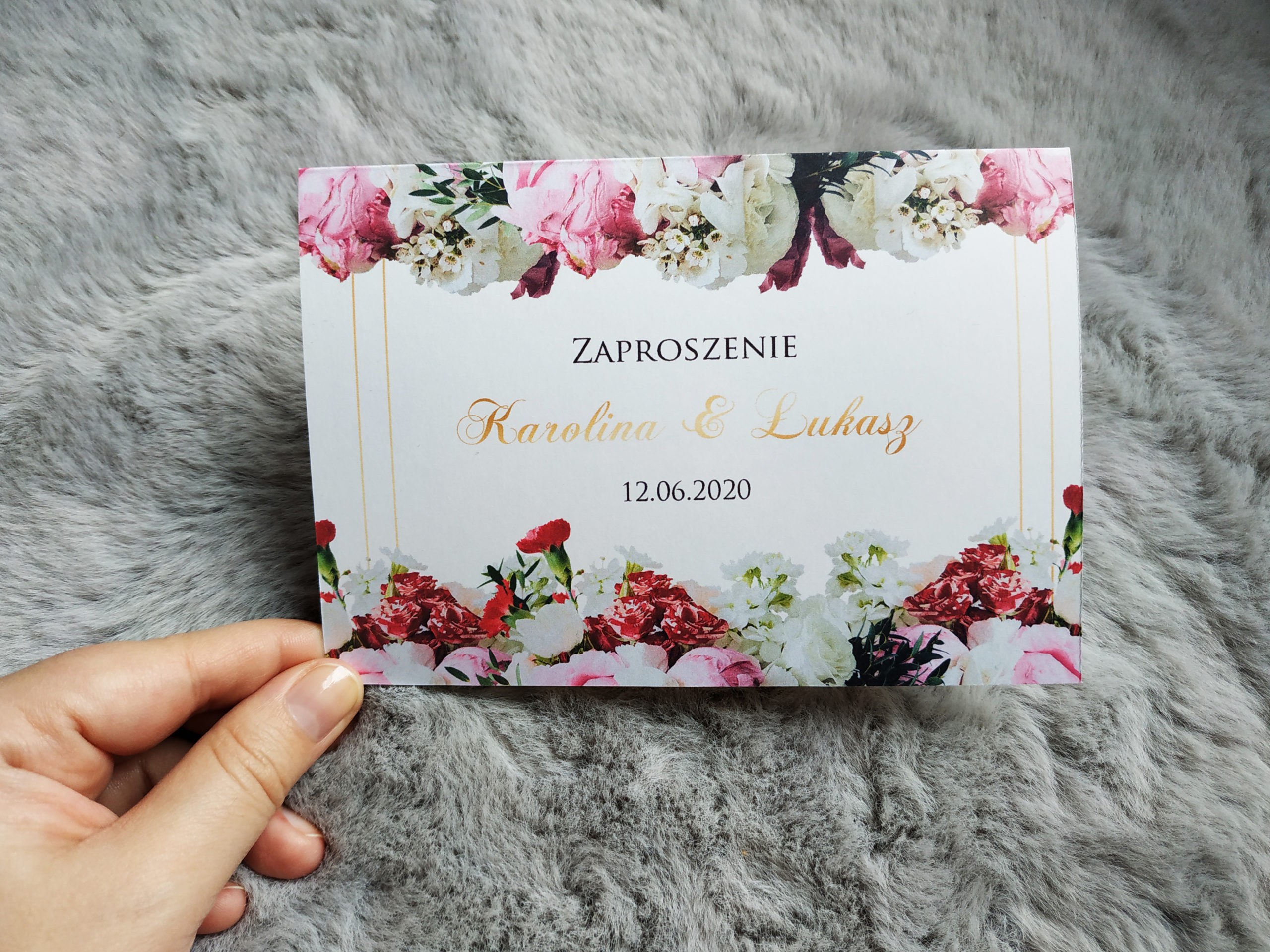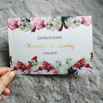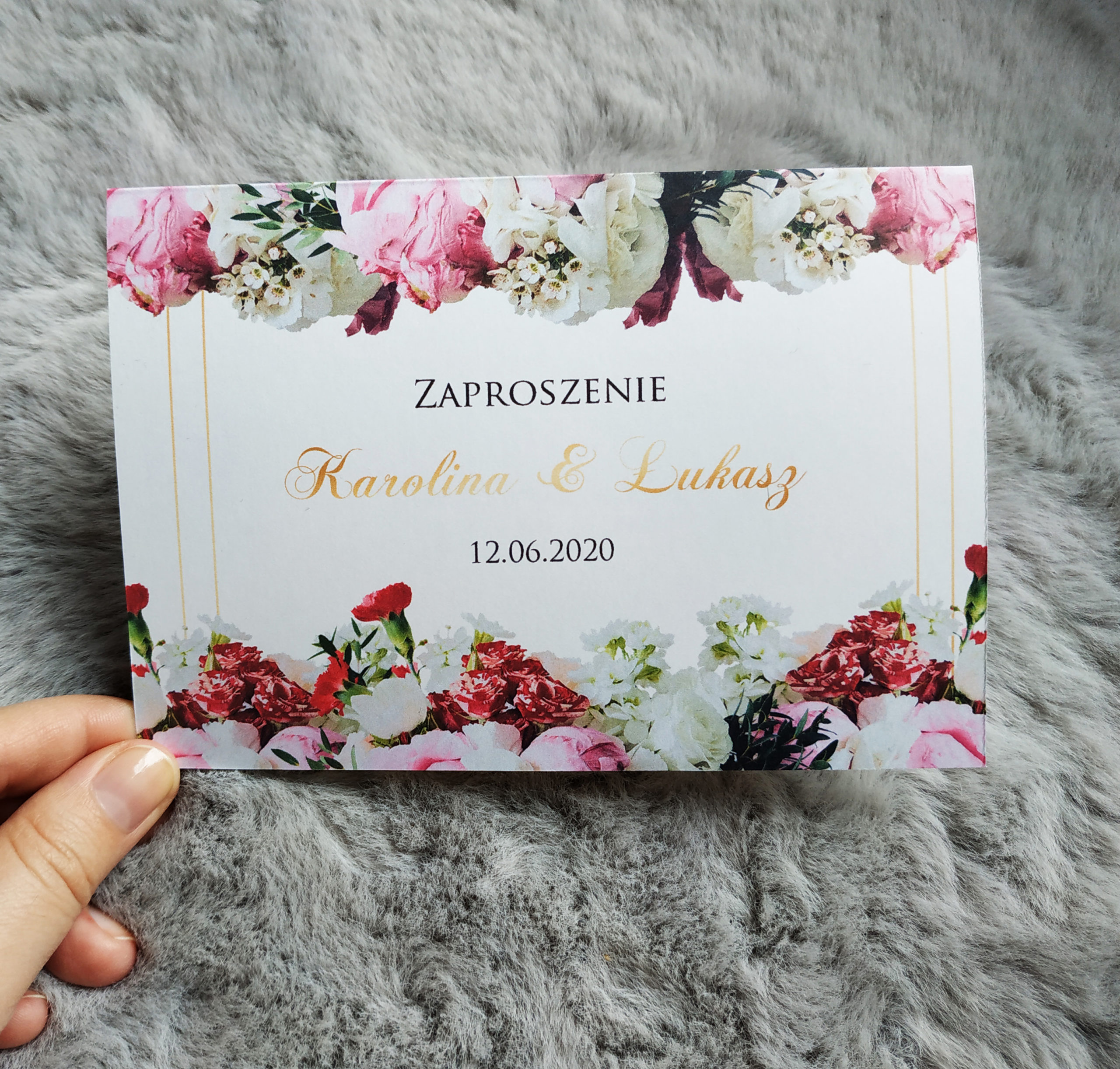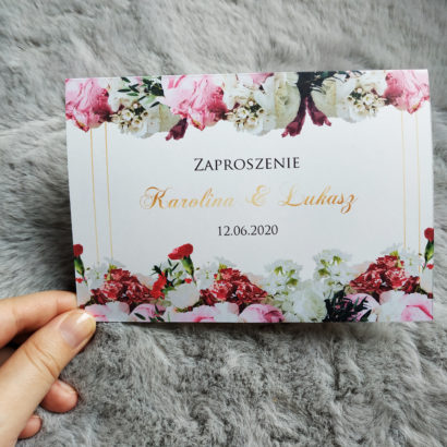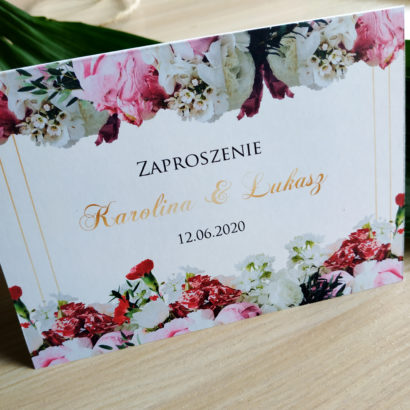 Zaproszenie w formie prostokąta, na okładce piękne kwiaty piwonii, róż oraz goździków. Idealne osób, których wesele będzie pełne kwiatów. Piękne połączenie z złotymi elementami geometrycznymi oraz imionami Młodej Pary. Podana cena dotyczy 1 sztuki zaproszenia. Koperty sprzedawane osobno.
