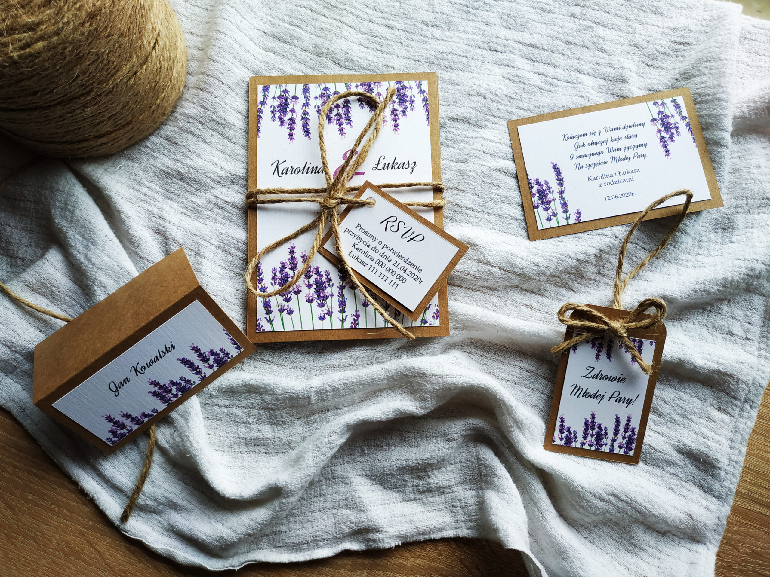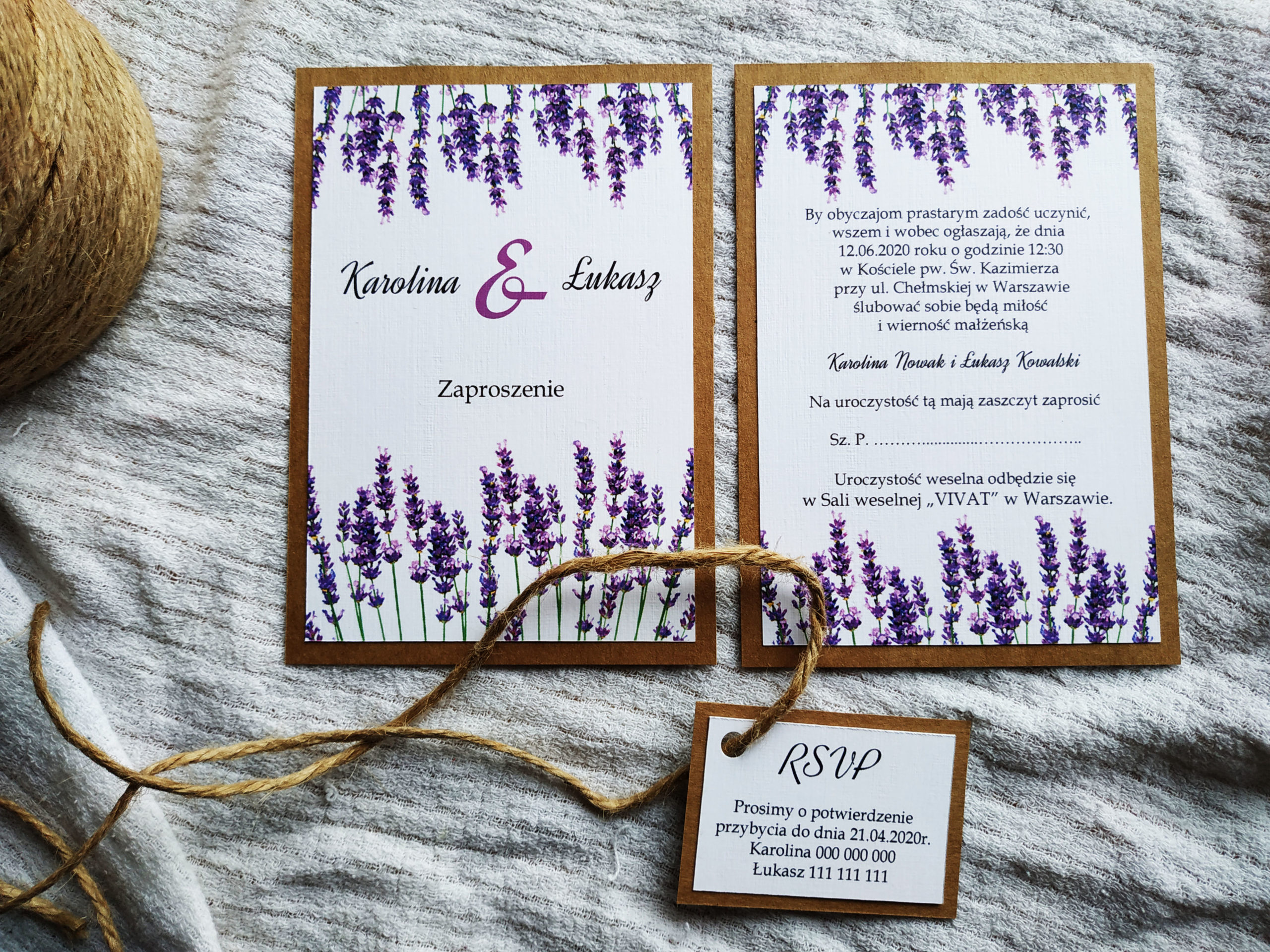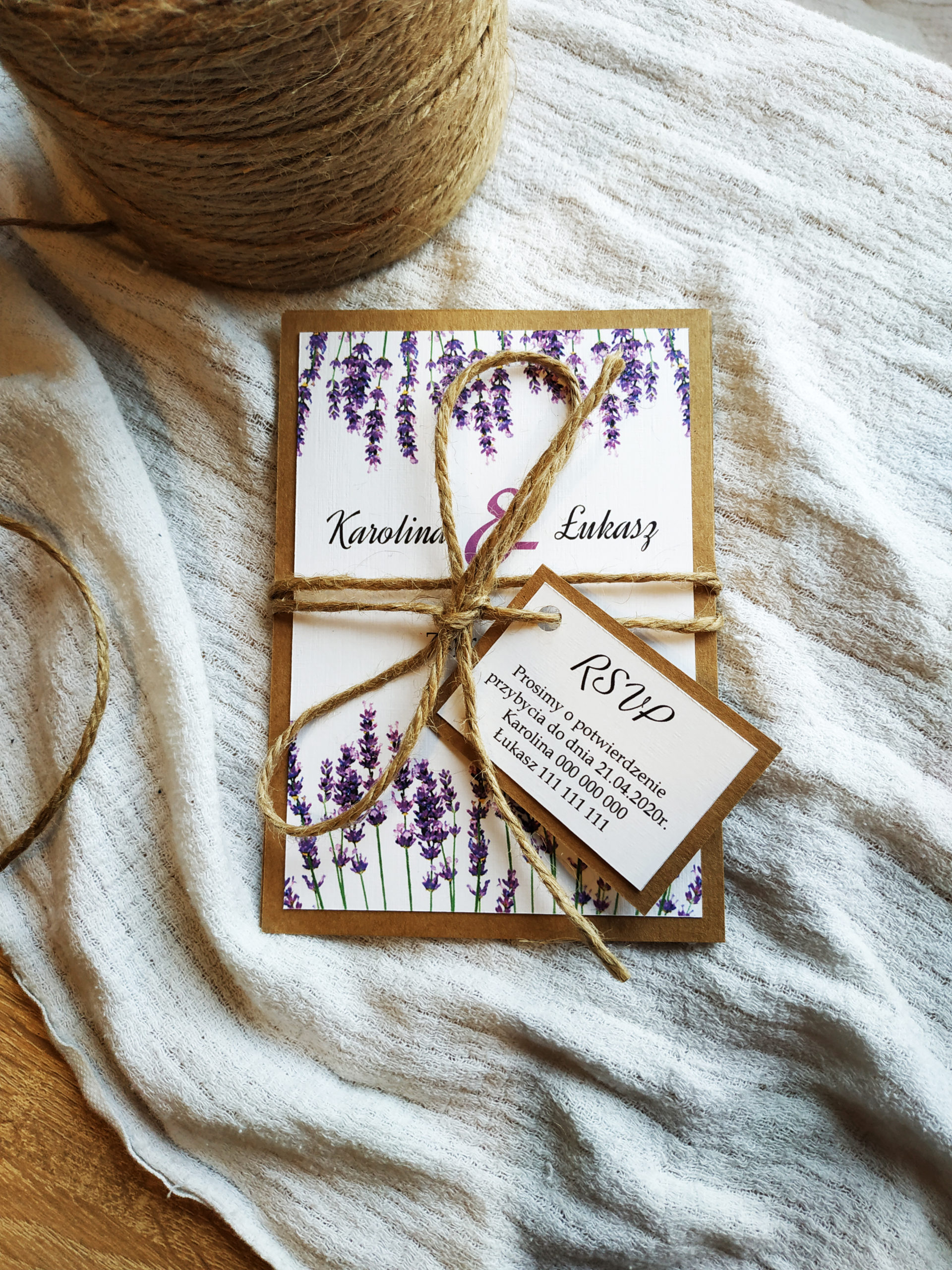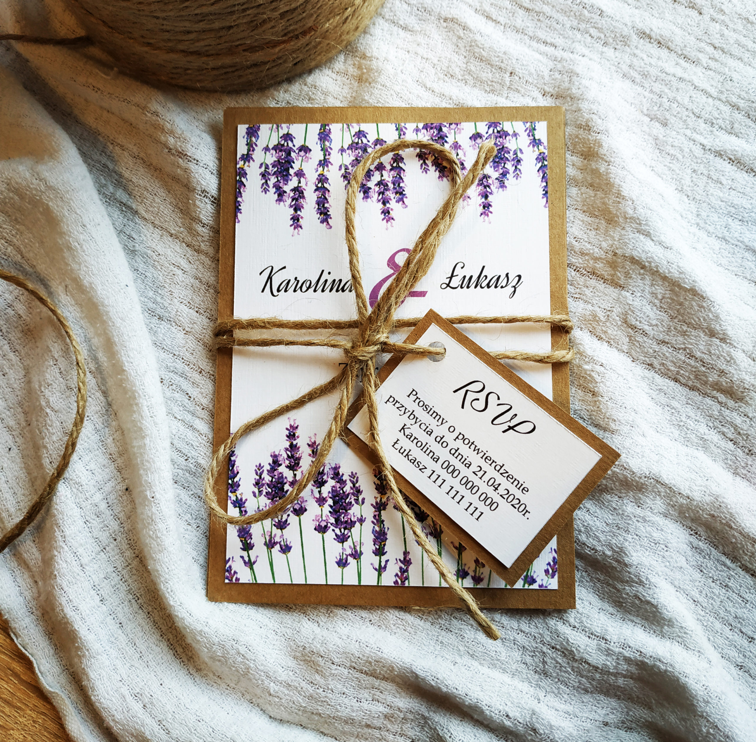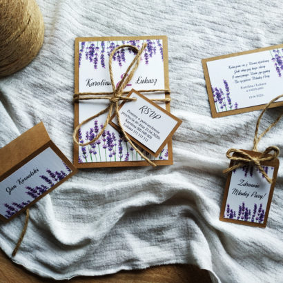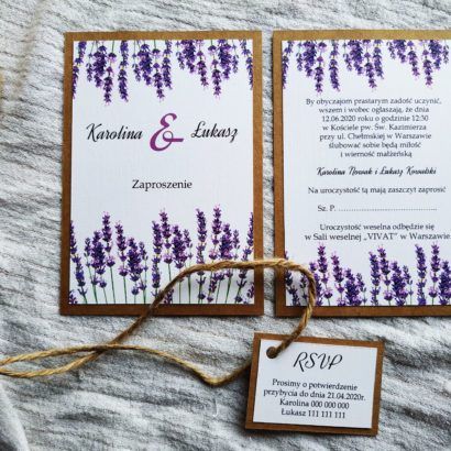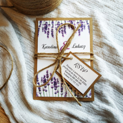 Romantyczne i stylowe zaproszenie z motywem lawendy na podkładce z eko papieru. Zaproszenie składa się z dwóch osobnych kartek oraz małej karteczki RSVP, która jest zamocowana do sznurka jutowego, którym jest przewiązana całość.