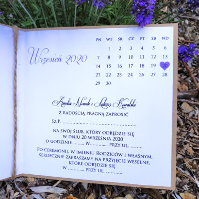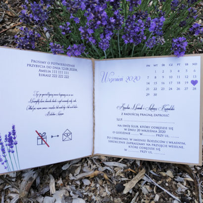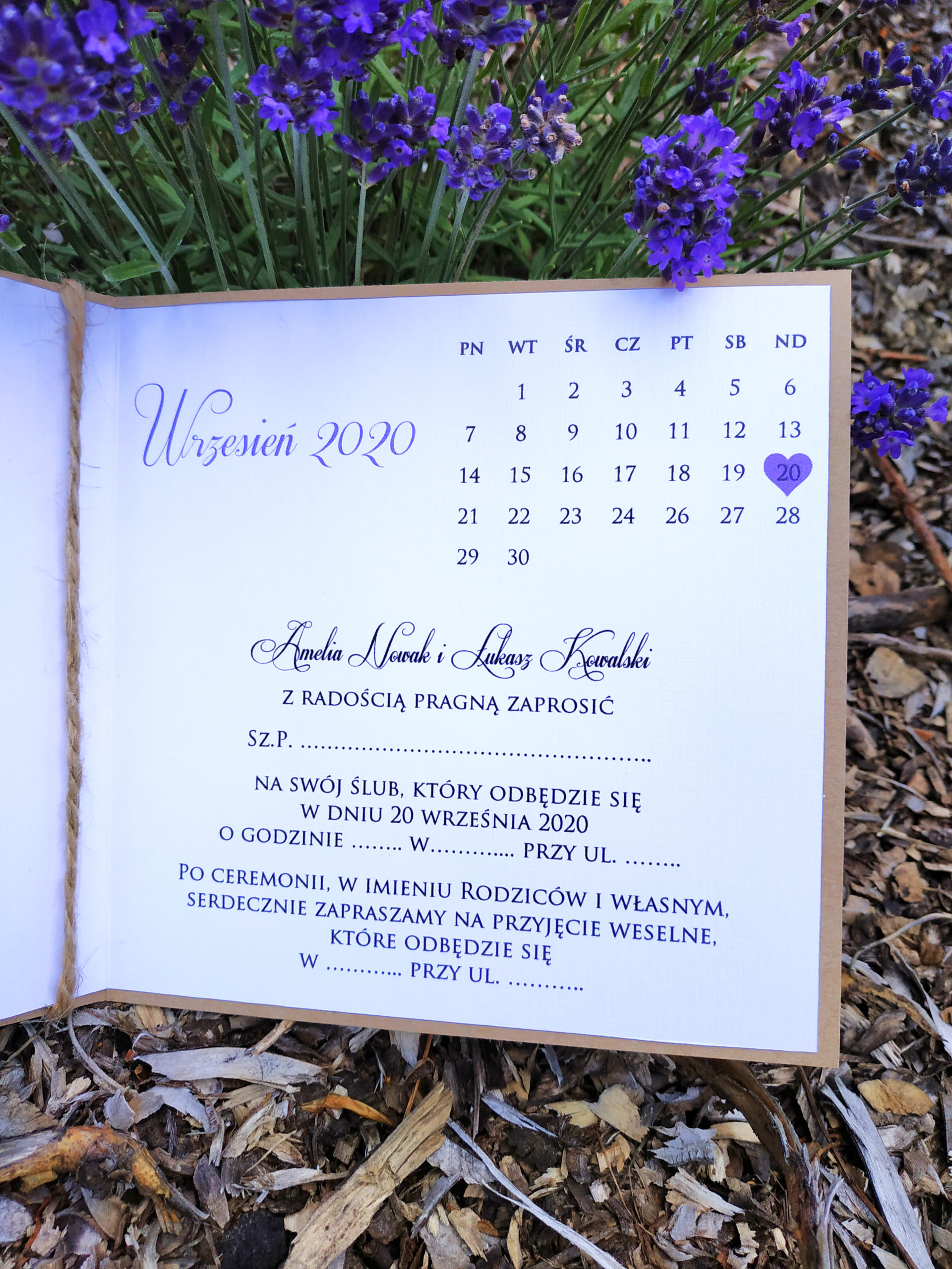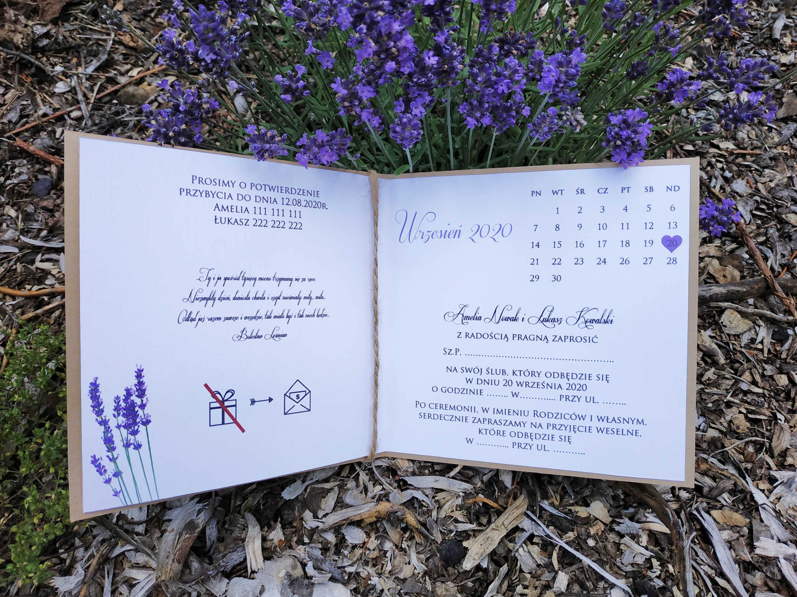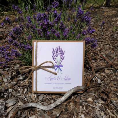 Romantyczne zaproszenie z bukietem kwiatów lawendy. Idealne na wrześniowo – październikowe wesela, gdzie króluje wrzos i lawenda.
