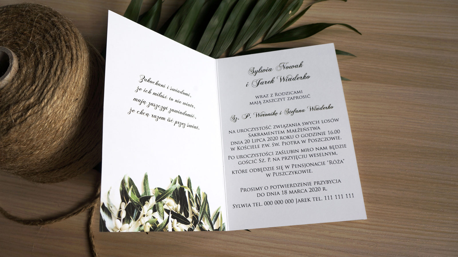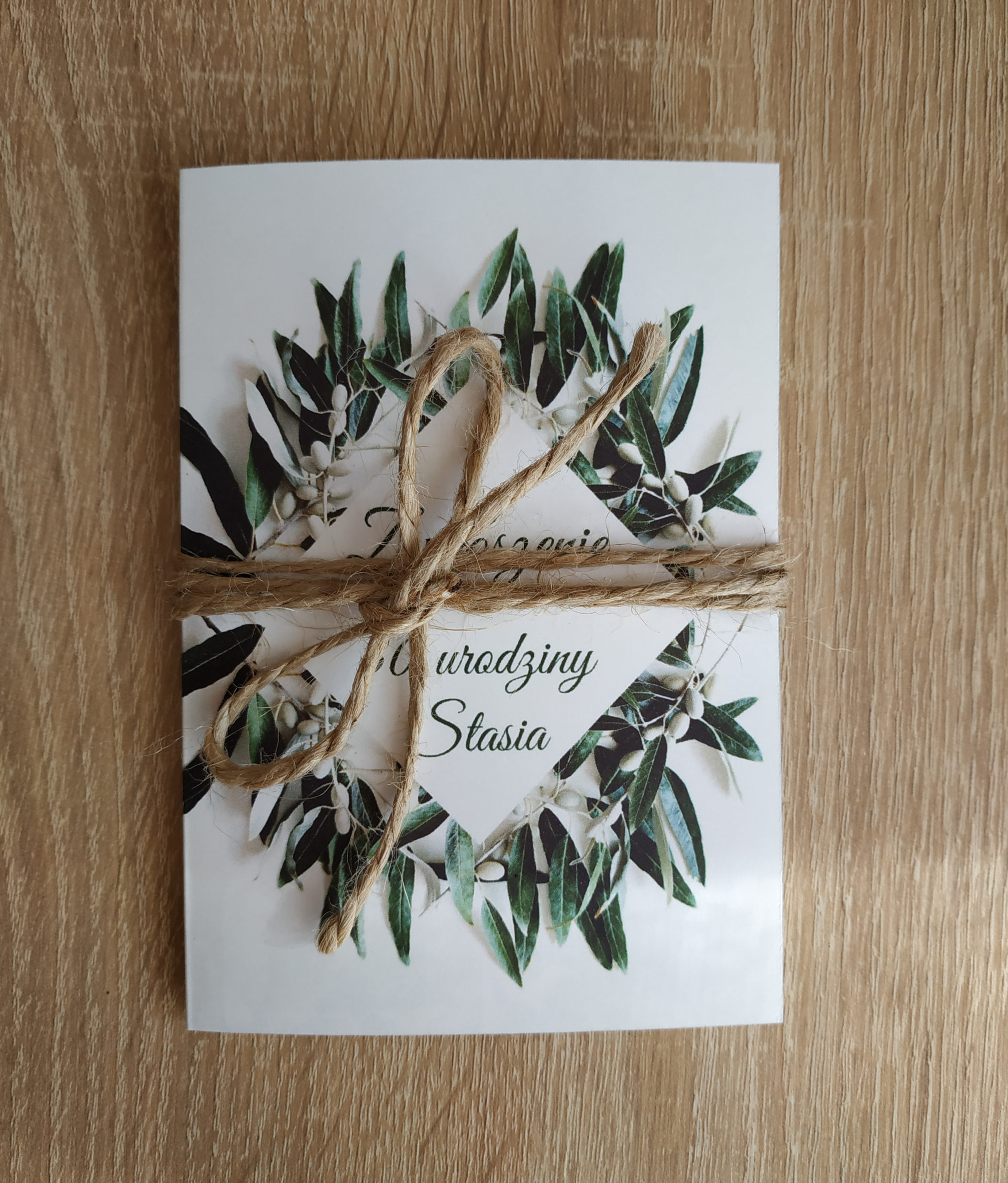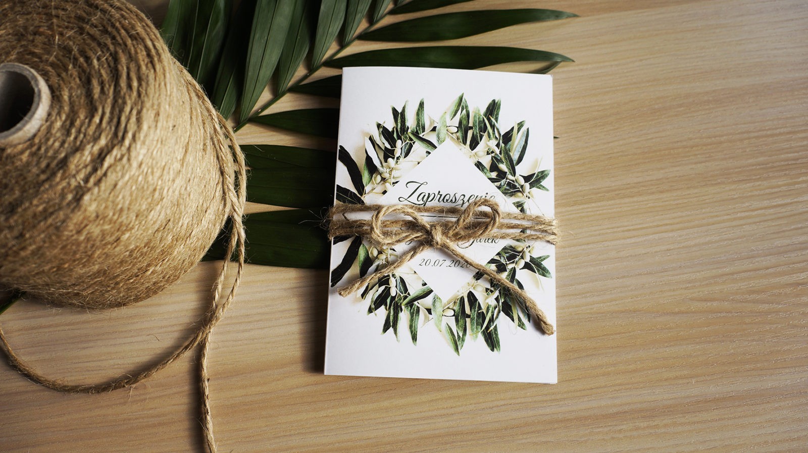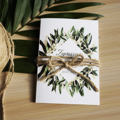 Zjawiskowe zaproszenie z gałązkami oliwnymi przeplecione sznurkiem jutowym zachwyci Twoich gości. Idealnie komponuje się z dodatkami na ślubach rustykalnych i w stylu boho organizowanych na łonie natury. Zielone oliwne listki to najbardziej pożądany motyw ostatnich miesięcy.