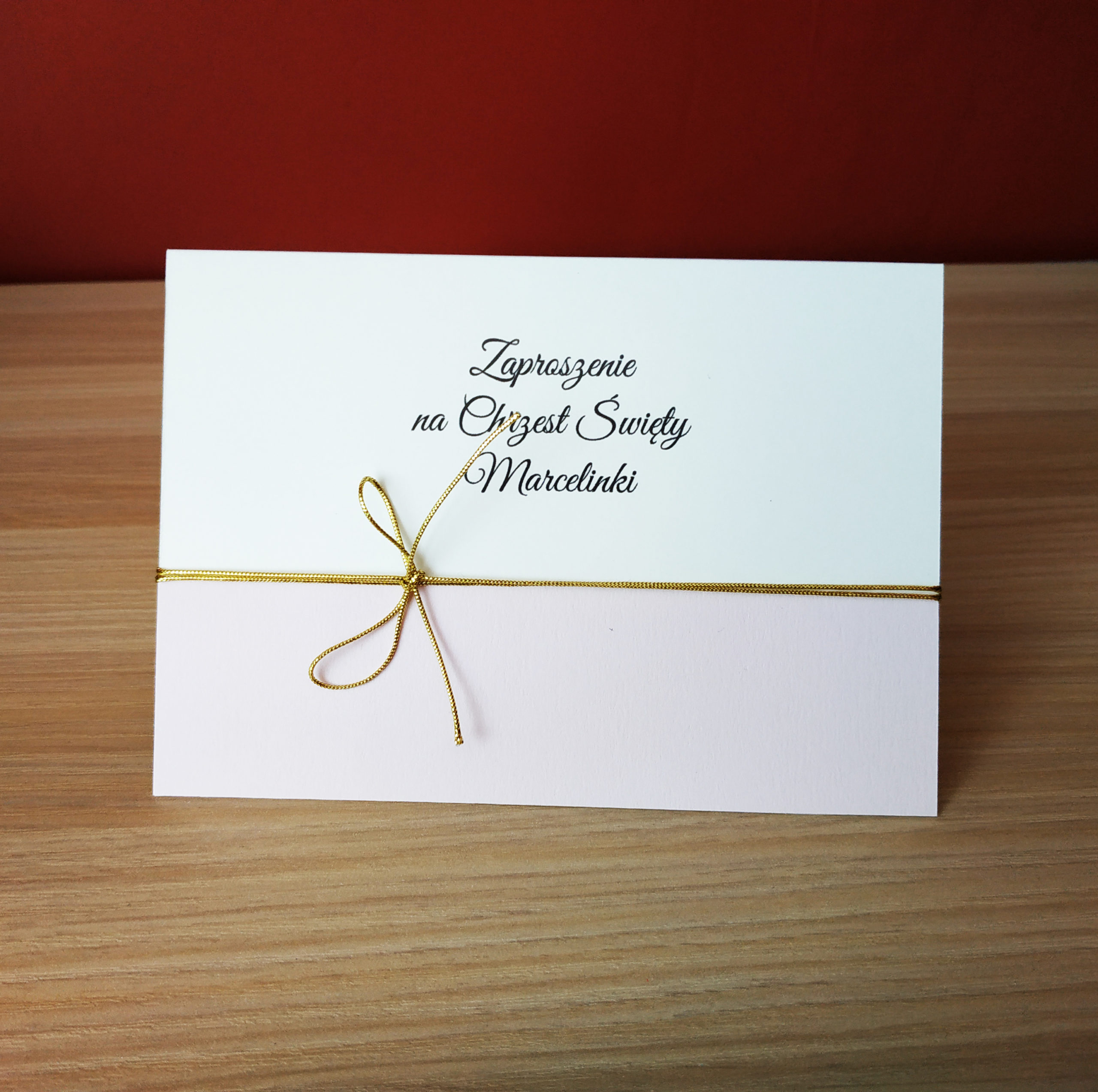 Eleganckie, pastelowe zaproszenie na Chrzest Święty dla dziewczynki lub chłopczyka, przewiązane błyszczącym złotym/srebrnym sznureczkiem.