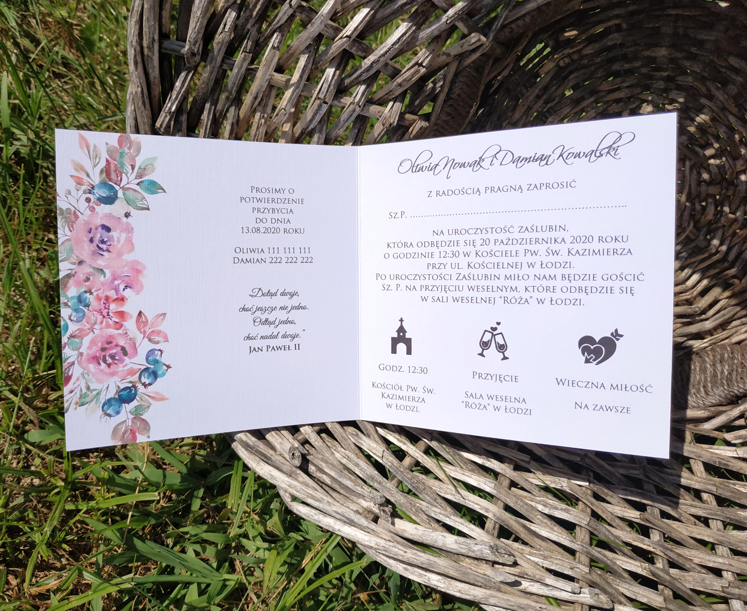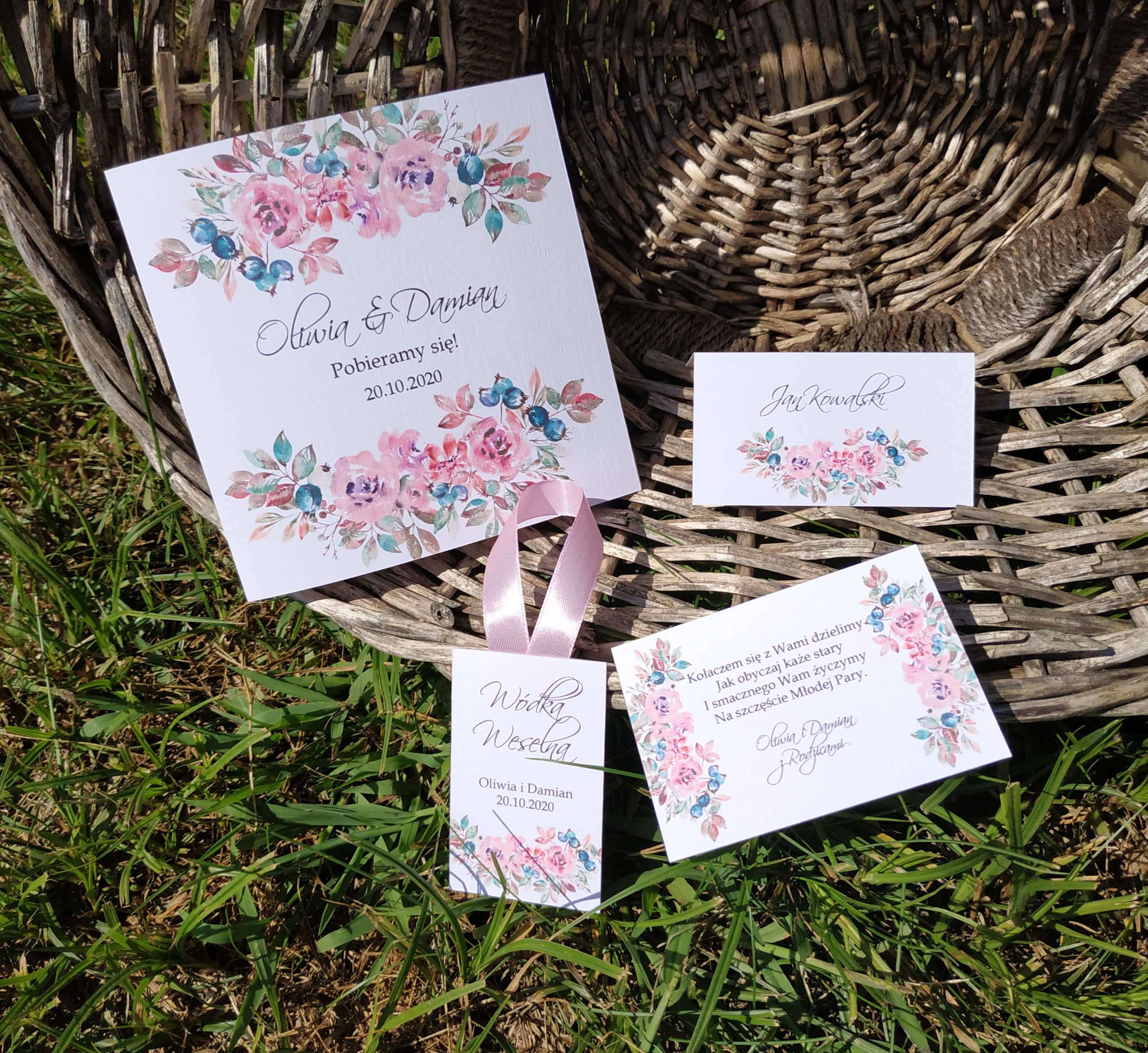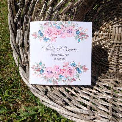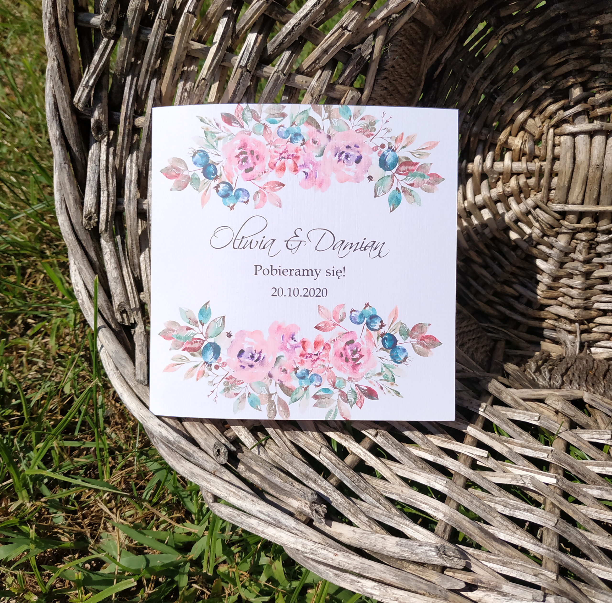 Romantyczne zaproszenie w kształcie kwadratu, na papierze o fakturze płótna. Na okładce delikatna kompozycja róż i jagód. Pełne uroku.