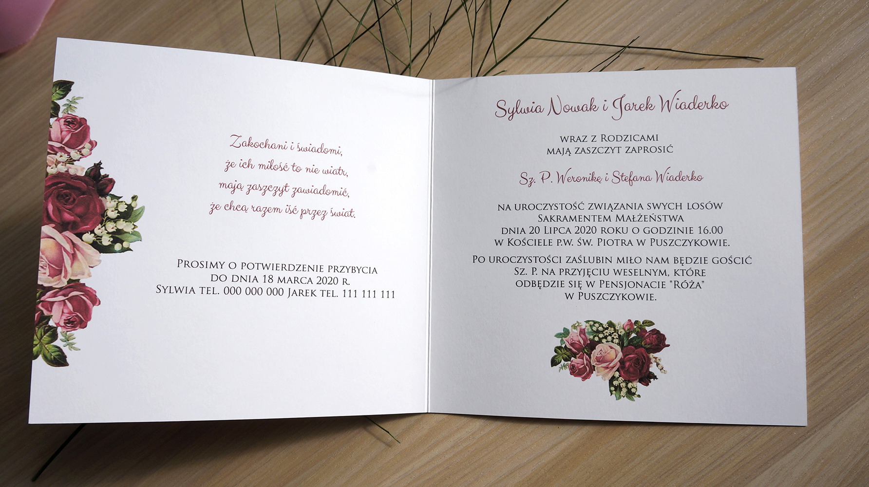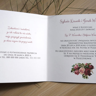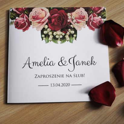 Piękne połączenie róż i konwalii. Zaproszenie pełne uroku i ciepła, z pewnością zachwyci Twoich gości. Motyw kwiatów pojawia się także we wnętrzu zaproszenia.