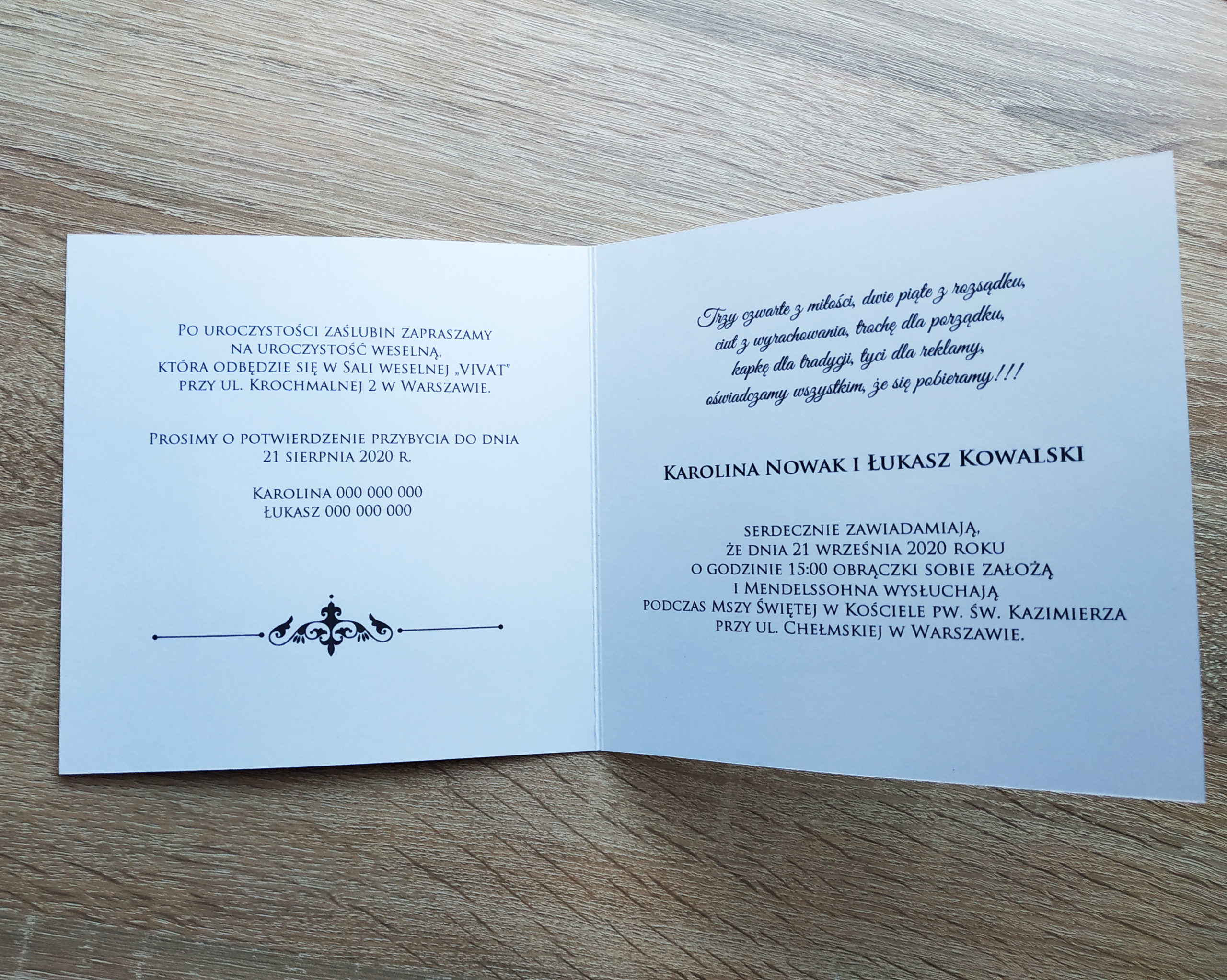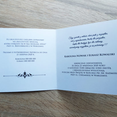 – treść wnętrza: własna lub wybrana z zakładki „Treści do zaproszeń”,
