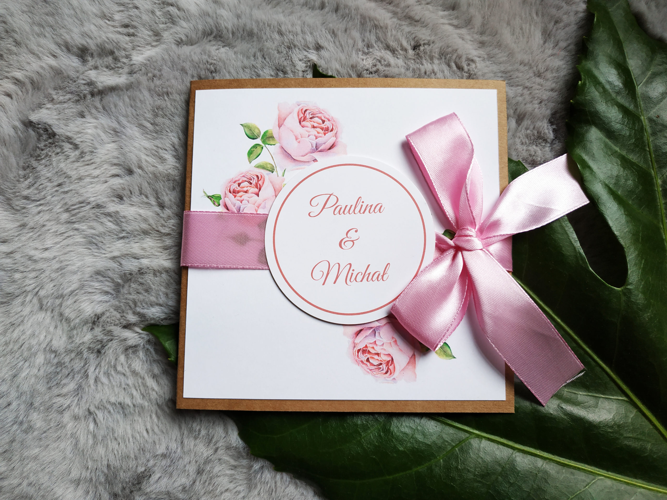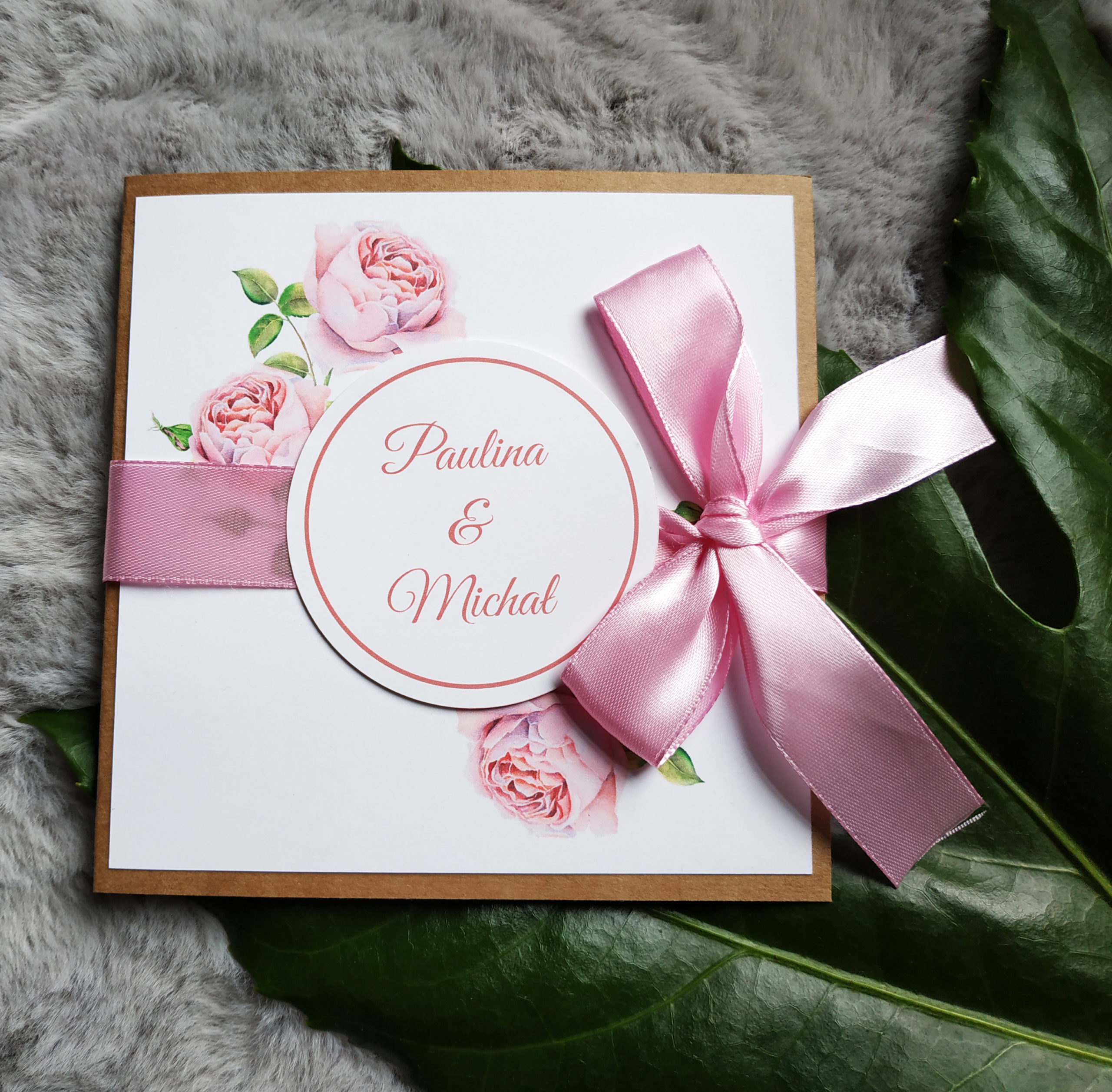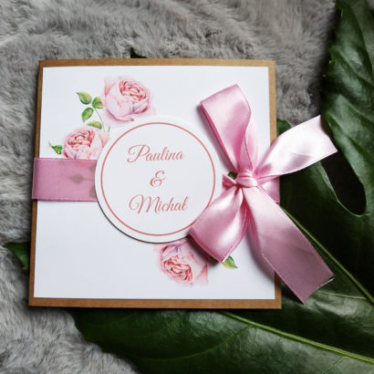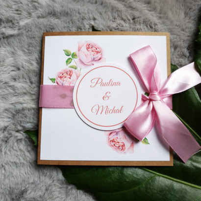 Cudowne i delikatne zaproszenie z motywem różowych różyczek na podkładce z eko papieru. Idealne jeśli Twoim weselnym kolorem jest róż. Całość przewiązana wstążką oraz ozdobiona kółkiem w którym widnieją imiona Młodej Pary.