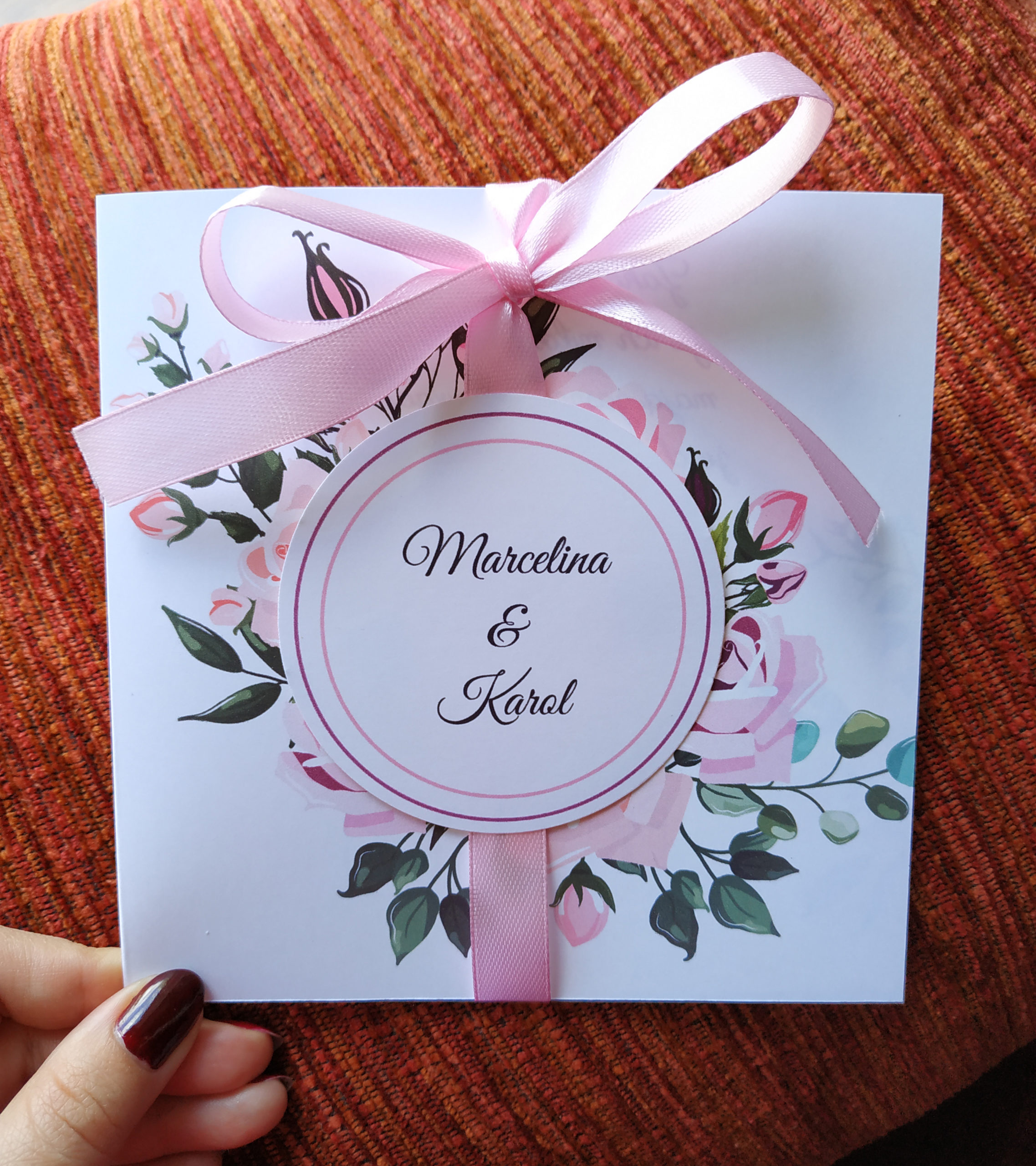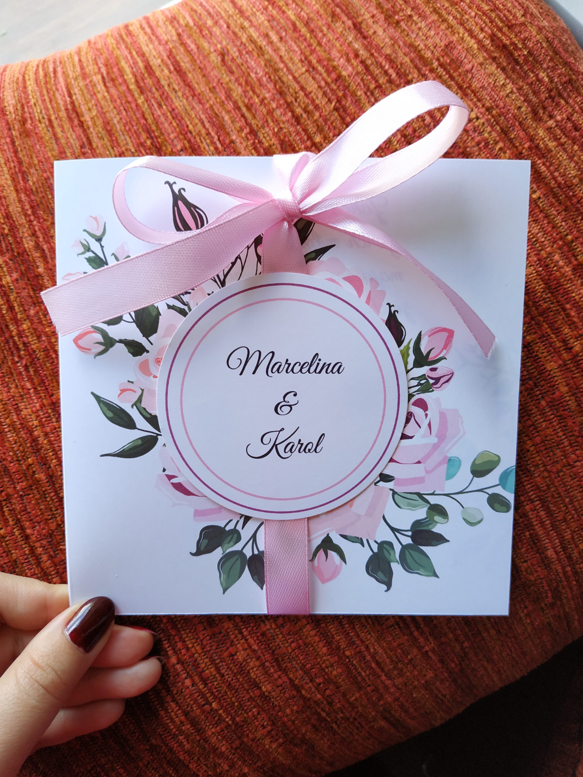 Bardzo romantyczne zaproszenie z subtelnymi różowymi różami w pięknej formie wianka. Przewiązane cienką różową wstążką.