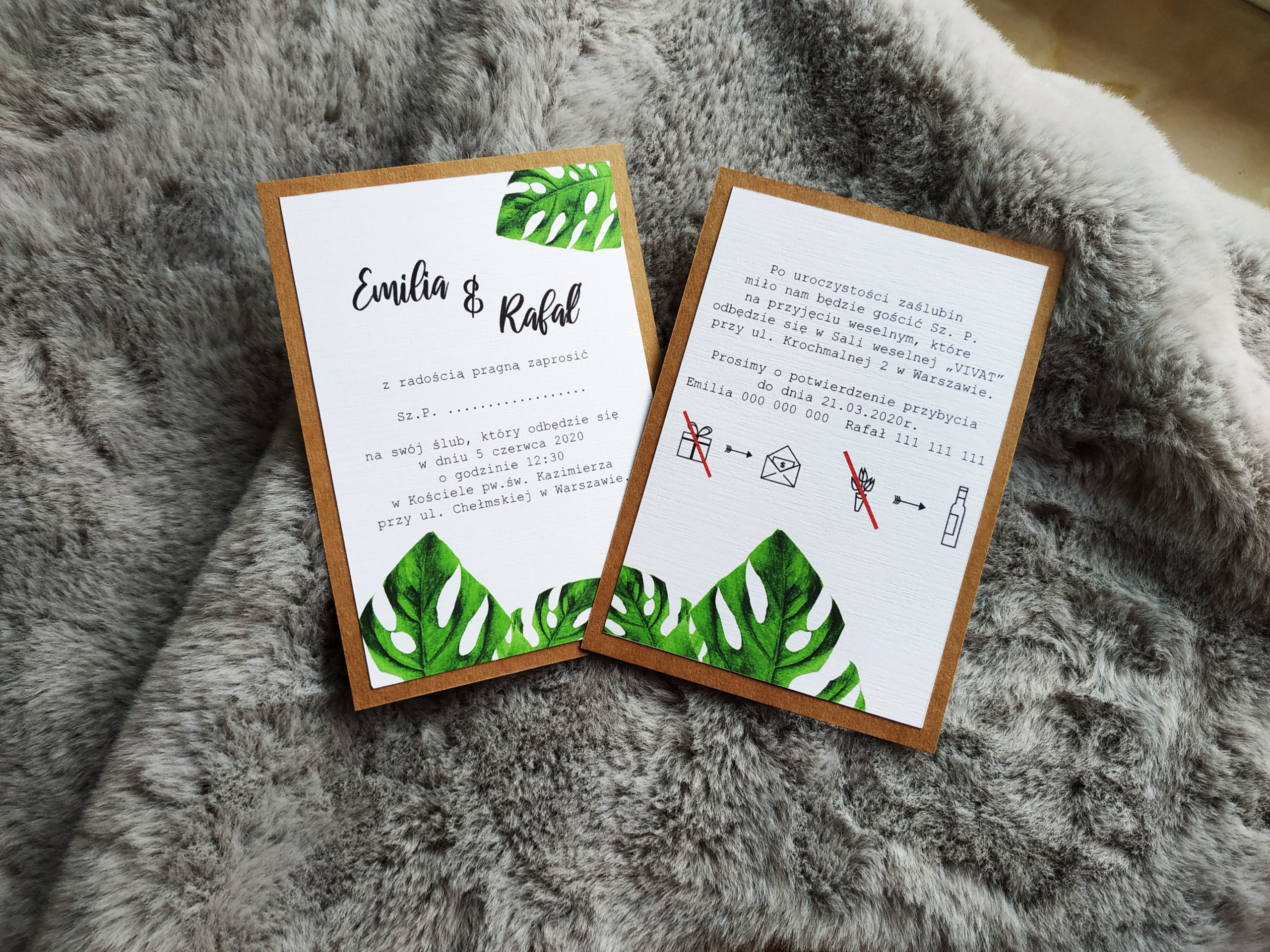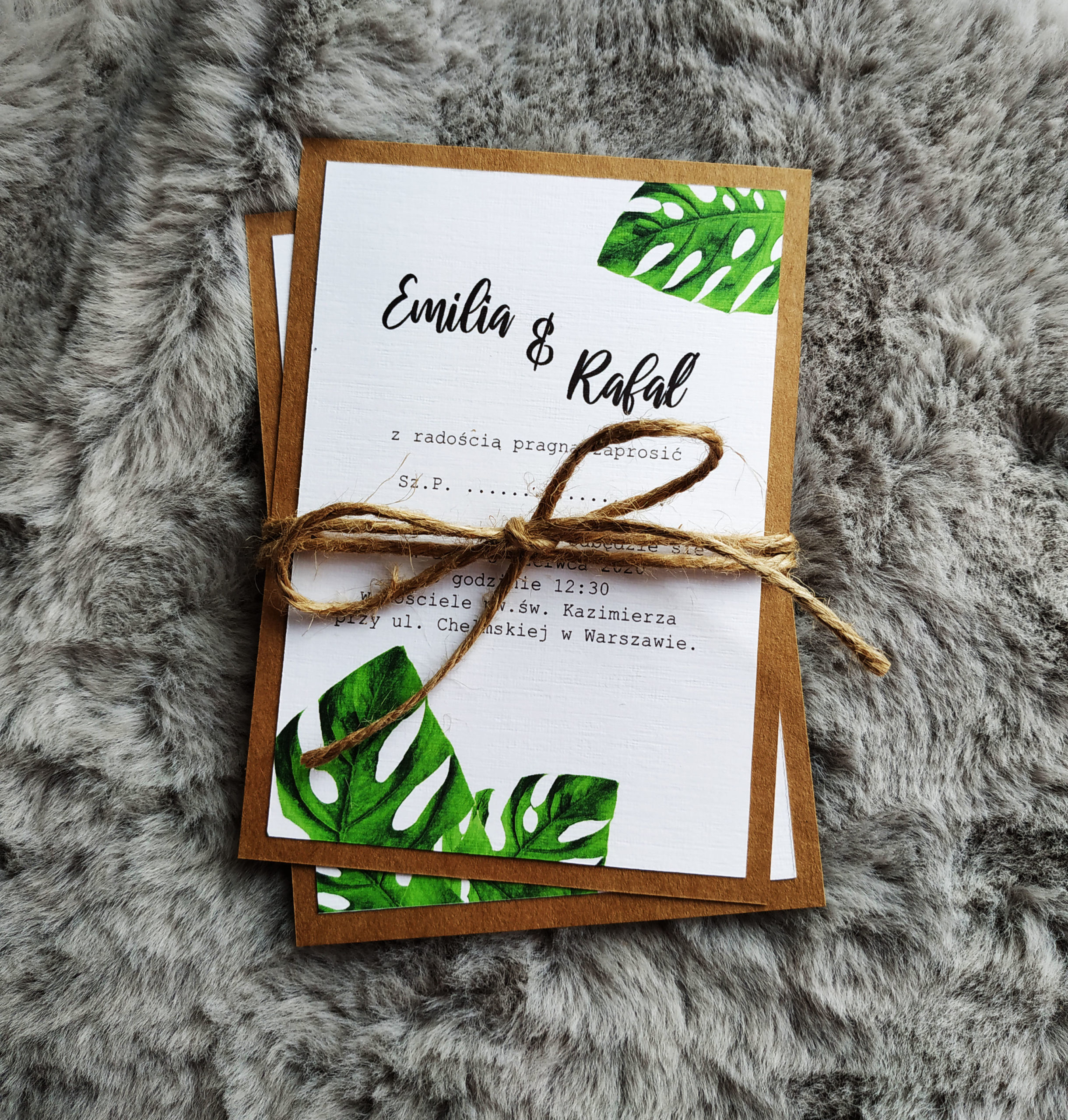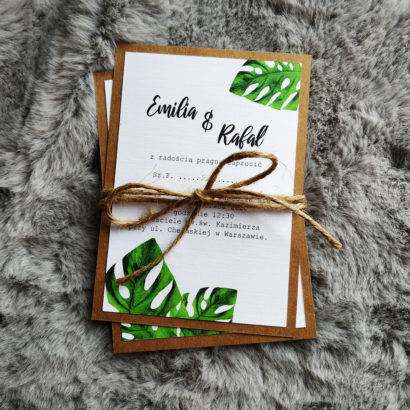 Zaproszenie z modnym i nowoczesnym wzorem liści monstery. Wykonane na papierze o fakturze płótna, naklejone na podkładkę z papieru ekologicznego. Zaproszenie składa się z dwóch osobnych kartek, przewiązanych sznurkiem jutowym. Podana cena dotyczy 1 sztuki zaproszenia.