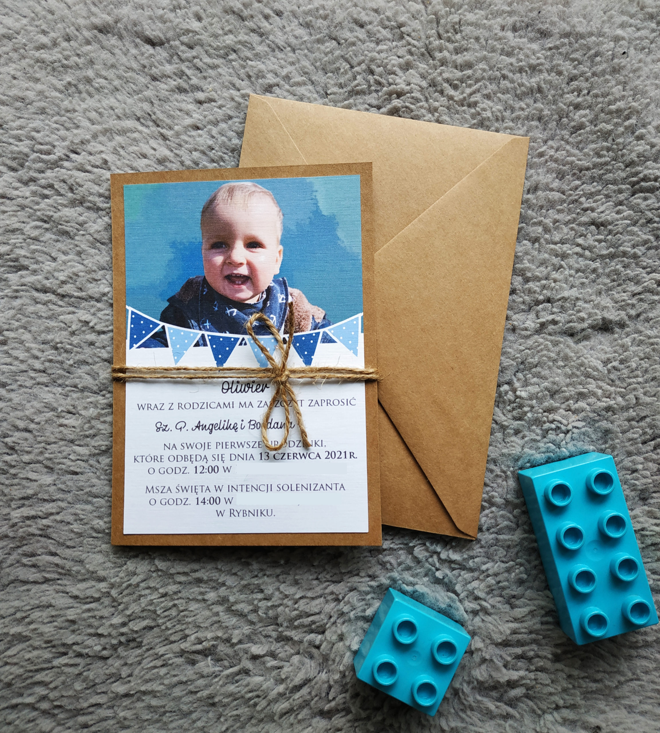 Wyjątkowe zaproszenia na roczek wykonane ze starannością i dbałością o każdy szczegół, z wysokiej jakości materiałów. W pełni spersonalizowane zaproszenia ze zdjęciem mile zaskoczą waszych gości. Zaproszenie wykonane na papierze o fakturze płótna, naklejone na podkładkę z papieru ekologicznego. Całość przewiązana delikatnym sznurkiem jutowym. Zdjęcie jest wydrukowane i jego jakość może się różnić od tej widzianej na monitorze. Nie jest to zdjęcie wywoływane profesjonalnie na papierze fotograficznym! Podana cena dotyczy 1 sztuki. Koperta ekologiczna C6 GRATIS.