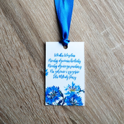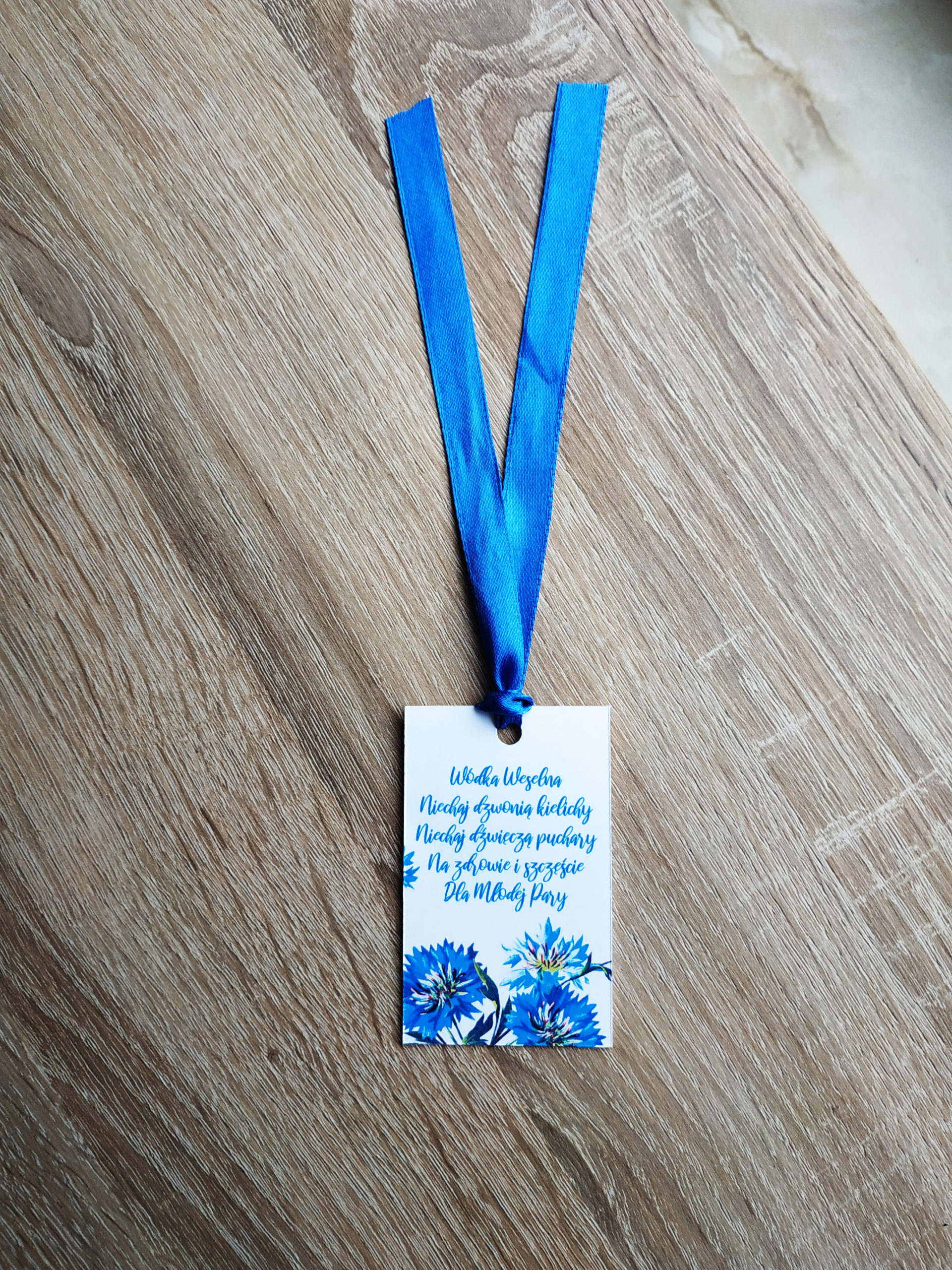 Przepiękna niebieska zawieszka z kolekcji Chabry. Świetnie się sprawdzi jako zawieszka na Twój alkohol. Idealnie wpasuje się w kształt każdej butelki, dzięki wstążce do samodzielnego zawiązania.