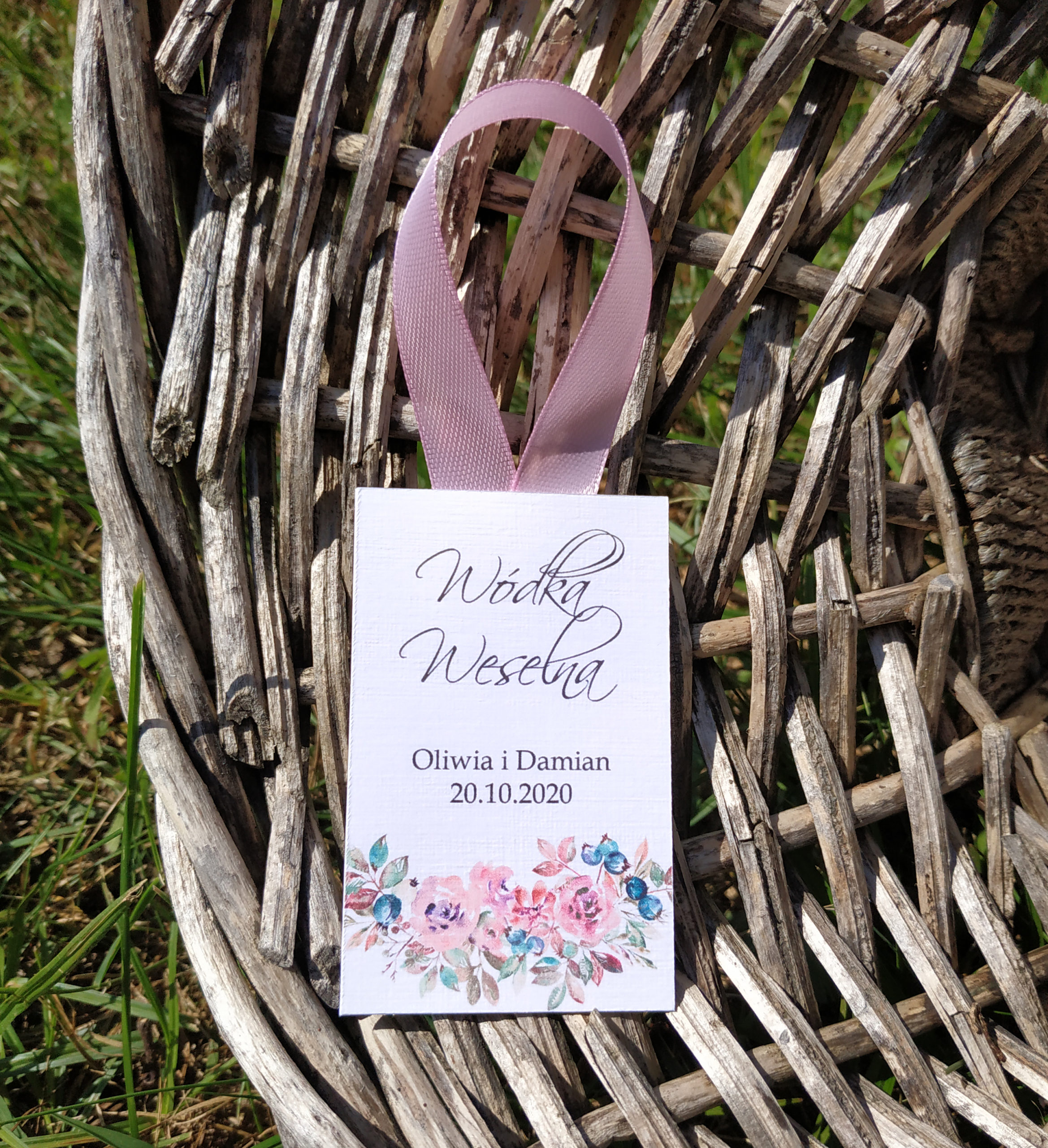 Zawieszka z kolekcji Różany ogród, na różowej satynowej wstążce. Świetnie się sprawdzi jako zawieszka na Twój alkohol.