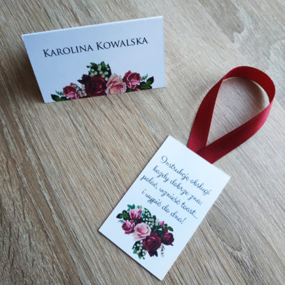 Cudowna zawieszka na bordowej wstążce. Pięknie się prezentują kwiaty róży i konwalii. Świetnie wygląda z pozostałymi dodatkami z kolekcji Róże i konwalie. Tekst dowolny. Podana cena dotyczy 1 sztuki. Możliwość zmiany koloru wstążki, np. na złotą.